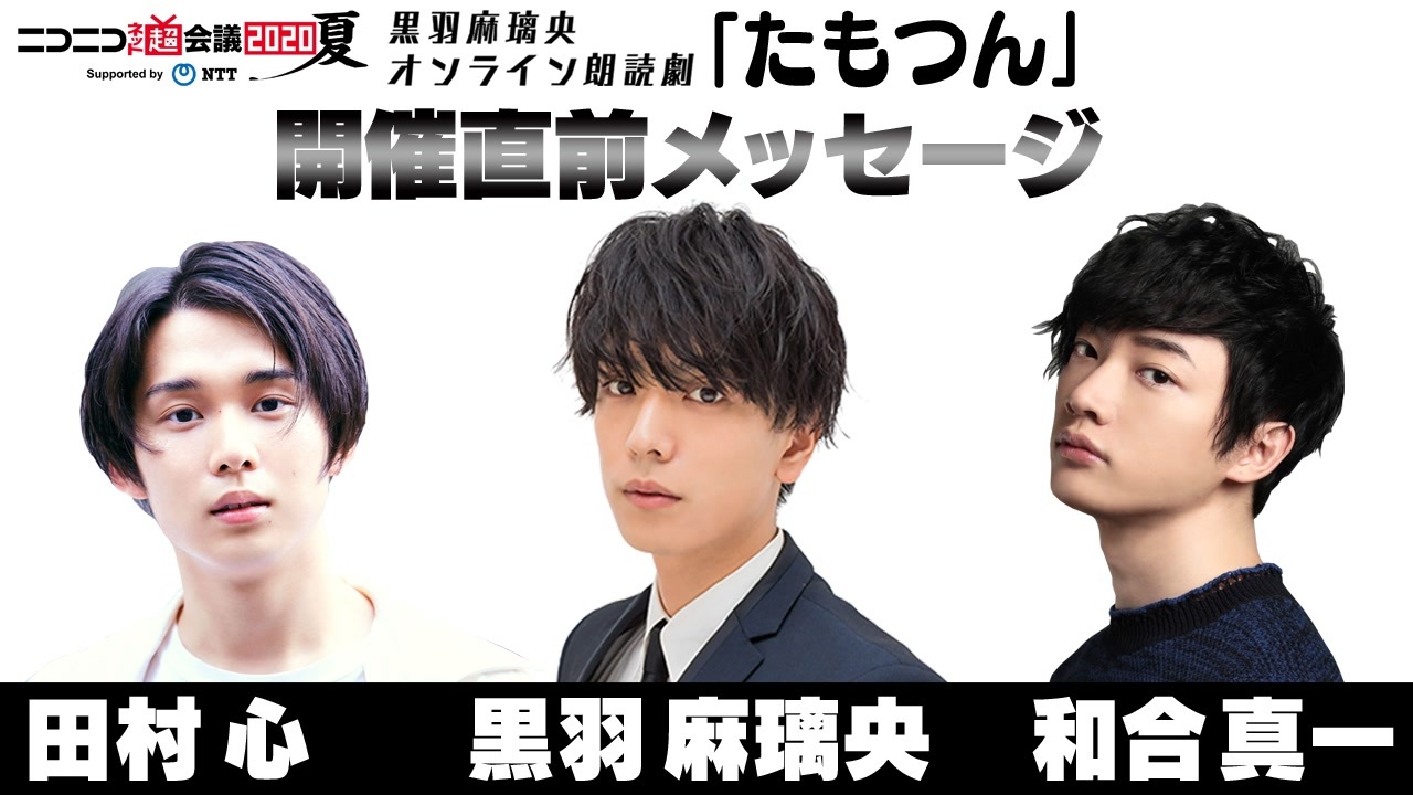 俳優・黒羽麻璃央らによるオンライン朗読劇を開催!<br>ちょいダメ男たちの、くすっと笑えて、くすっと泣ける、友情コメディをお届けします!<br><br>8月15日(土)17時公演:<a href="https://live.nicovideo.jp/watch/lv327141277" target="_blank" rel="noopener">lv327141277</a><br>8月15日(土)20時公演:<a href="https://live.nicovideo.jp/watch/lv327141556" target="_blank" rel="noopener">lv327141556</a><br><br>【あらすじ】<br>横浜で営業職をしているユーキチ(黒羽麻璃央)は、古ぼけた喫茶に呼び出されていた。<br>そこで待っていたのは野球部時代のウザい先輩・ヤベ先輩(和合真一)と、空気が読めないお坊ちゃん・しゅうまい(田村心)。<br>ユーキチは彼らと共に、二か月後に控えた野球部の同期「たもつん」の結婚式の余興を行うことになるのだが……<br><br>【出演者】<br>黒羽麻璃央、田村心、和合真一<br>声のみの出演:小野賢章、飯田里穂<br><br>【脚本】<br>吉田 恵里香<br><br>【演出】<br>山田雅史(映画監督)<br><br><br>【ネットチケット】<br><a href="https://secure.live.nicovideo.jp/event/kuroba_recitation" target="_blank" rel="noopener nofollow">https://secure.live.nicovideo.jp/event/kuroba_recitation</a><br><br><br>ニコニコネット超会議2020夏 Supported by NTT – 開催概要<br>開催日時 :2020年8月9日(日)~8月16日(日)<br>主催 :ニコニコ超会議実行委員会<br>会場 :niconico公式サイト・総合TOP <a href="https://www.nicovideo.jp/" target="_blank" rel="noopener nofollow">https://www.nicovideo.jp/</a><br>公式サイト : <a href="http://www.chokaigi.jp" target="_blank" rel="noopener nofollow">http://www.chokaigi.jp</a><br>公式Twitter : <a href="https://twitter.com/chokaigi_PR" target="_blank" rel="noopener nofollow">https://twitter.com/chokaigi_PR</a>