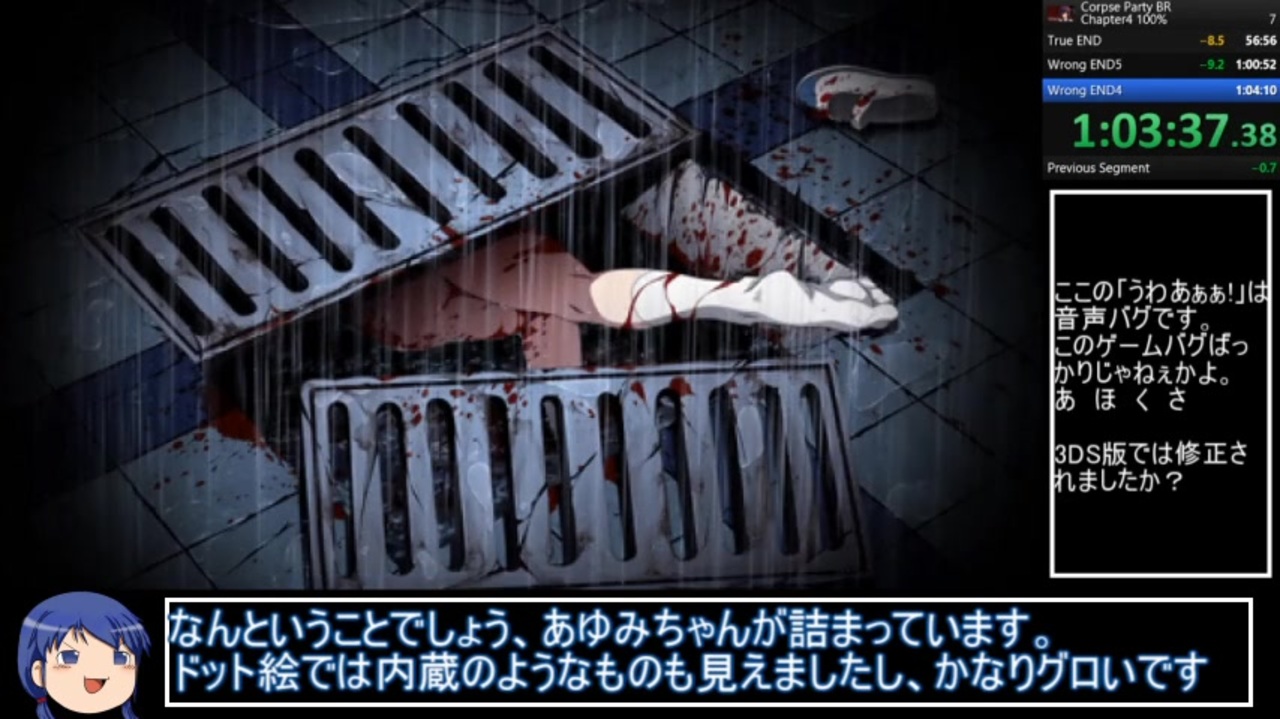 パート分けしたRTA動画は初投稿です。<br><br>コープスパーティーブラッドカバーリピーティッドフィアー(PSP/日本語版)のChapter4 100%RTAです。<br><br>Chapter1 → <a href="https://www.nicovideo.jp/watch/sm37071734" class="watch">sm37071734</a><br>Chapter2 → <a href="https://www.nicovideo.jp/watch/sm37143143" class="watch">sm37143143</a><br>Chapter3 → <a href="https://www.nicovideo.jp/watch/sm37213176" class="watch">sm37213176</a><br>Chapter4 part1/2 → <a href="https://www.nicovideo.jp/watch/sm37308785" class="watch">sm37308785</a><br>Chapter5 → <a href="https://www.nicovideo.jp/watch/sm37416249" class="watch">sm37416249</a><br><br><strong><a href="https://ec.nintendo.com/JP/ja/titles/70010000032976" target="_blank" rel="noopener nofollow">https://ec.nintendo.com/JP/ja/titles/70010000032976</a><br>↑Nintendo Switch版「コープスパーティーBlood Drive」が販売中(ダウンロード版のみ)。難易度が少し下がったとのことなので、みんな、買おう!</strong><br><br>無編集版(youtube) → <a href="https://www.youtube.com/watch?v=DPZP8gthUtE" target="_blank" rel="noopener nofollow">https://www.youtube.com/watch?v=DPZP8gthUtE</a><br>twitter → <a href="https://twitter.com/41LANCER1" target="_blank" rel="noopener nofollow">https://twitter.com/41LANCER1</a><br><br>追記:baba兄貴、抹茶グリーン兄貴、夏月ω兄貴、JJ10兄貴、tatibana兄貴、nobu_ddr兄貴、クソ犬☆(栄養肉)兄貴、wer兄貴、お肉兄貴、テトアイス兄貴、caliber .50兄貴、gigi兄貴、ティス兄貴、baggio兄貴、イガぐり兄貴、カルボン兄貴、あやはら兄貴、ショコラ兄貴、うれあっぷ兄貴、広告ありがとうございます、励みになります。<br>森繁君は繭ちゃんとナニしてたか教えて?持田哲志君は由香ちゃんを探してくれ。世以子ちゃんは直美ちゃんを慰めてやってくれ。あゆみちゃんの叫び声が聞こえた気がしたが気のせいだろうか。