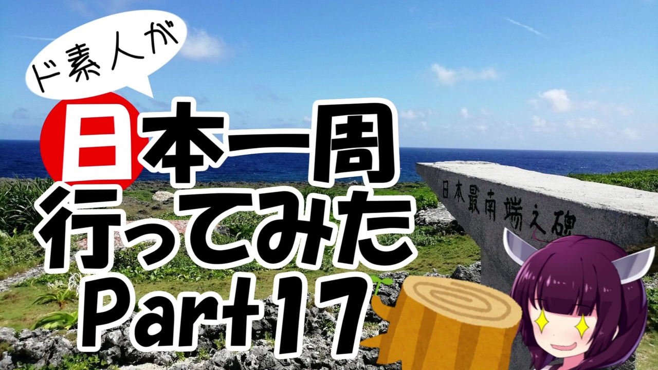 遂にやって来ました日本最南端。<br>しかしその道中は一筋縄ではいきません。<br>出会いあり、別れあり、吐き気ありでお届けします。<br><br>1080p対応です<br><br>前→Part16【<a href="https://www.nicovideo.jp/watch/sm37192334" class="watch">sm37192334</a>】<br>次→Part18【<a href="https://www.nicovideo.jp/watch/sm37516978" class="watch">sm37516978</a>】<br><br>Part1→【<a href="https://www.nicovideo.jp/watch/sm36018324" class="watch">sm36018324</a>】<br><br>ド素人が日本一周行ってみたのマイリスト→<a href="https://www.nicovideo.jp/mylist/64280441" target="_blank" rel="noopener">mylist/64280441</a><br><br>YouTube版→<a href="https://www.youtube.com/channel/UCTsmHpxtyOEQO_tkqZ4D42A" target="_blank" rel="noopener nofollow">https://www.youtube.com/channel/UCTsmHpxtyOEQO_tkqZ4D42A</a><br><br>詳細な感想などはTwitterやブログでどうぞ。<br>Twitter:<a href="https://twitter.com/kyobon_beginner" target="_blank" rel="noopener nofollow">https://twitter.com/kyobon_beginner</a><br>ブログ:<a href="https://kyobon-beginner.hatenablog.com" target="_blank" rel="noopener nofollow">https://kyobon-beginner.hatenablog.com</a>