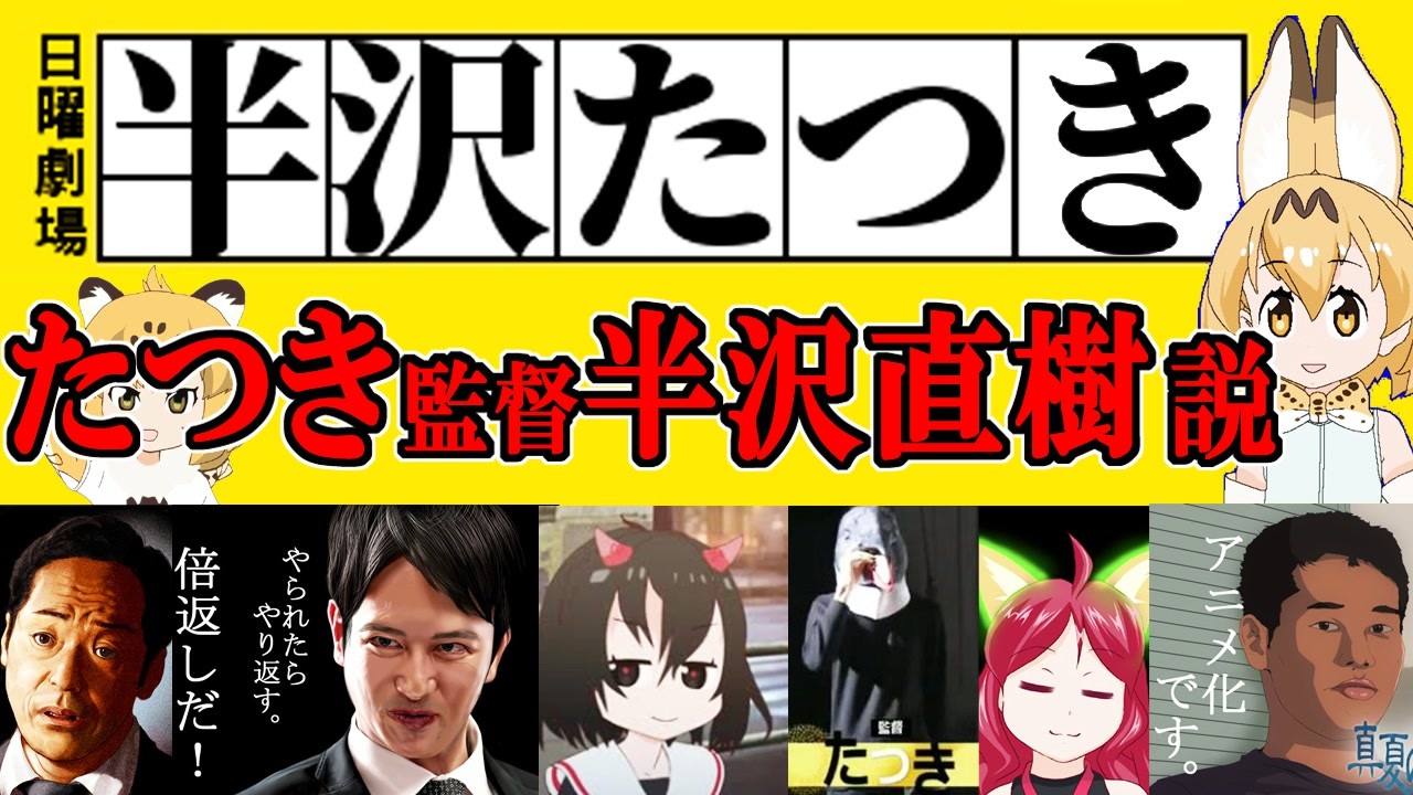 Youtube版を観たい方はこちらをどうぞ→<a href="https://www.youtube.com/watch?v=bUVcM4ebOLU" target="_blank" rel="noopener nofollow">https://www.youtube.com/watch?v=bUVcM4ebOLU</a><br>少しだけ内容が違いますので比べてみてください。<br><br>この動画は、現実に起こった925けもフレ事件、けものフレンズ2炎上事件、<br>ケムリクサ、へんたつといった作品と、<br>それによって現実世界で起こった事件を多分に取り扱います。<br>あらかじめご了承ください。<br><br>TBS系日曜劇場の人気ドラマ「半沢直樹」。<br>「けものフレンズ」「ケムリクサ」「へんたつ」で有名なアニメ監督の「たつき」。<br>実は両者には数々の共通点がある。<br>というより、半沢直樹とたつき監督は同一人物である。<br><br>また、「半沢直樹」は一部の視聴者より<br>「あれはサラリーマン版の水戸黄門。面白いけどリアリティーがない」<br>と言われているが、それはとんでもない誤解である。<br><br>どんな業界にも闇はあり、その闇と恐れず戦った人間は<br>半沢直樹のように結果を出すということを本動画で証明したい。<br><br>「半沢直樹」と「たつき監督」のどちらかを知っている、<br>あるいは、どちらも知らないという視聴者にも、<br>彼らの歩む道に興味を持ってもらえたら幸いである。<br><br>堺雅人演じる「半沢直樹」。<br>半沢直樹は銀行員であり、銀行から企業へ資金を貸す「融資」を担当している。<br>作品全体を通して「融資」が重要な要素である。<br><br>一方、たつき監督はアニメ監督であり、<br>「けものフレンズ」「ケムリクサ」「へんたつ」<br>といったヒット作品を世に送り出してきた。<br><br>一見、両者は何の関係も無さそうである。<br>だが、あえて言おう。<br><br><span style="color: #ff0000; font-size: 24px;"><strong><u>半沢直樹とたつき監督は同一人物である。</u></strong></span><br><br>10の根拠を挙げていきたい。<br><br><span style="font-size: 18px;"><strong>さらっとおさらい 大和田常務の土下座</strong></span><br><a href="https://www.nicovideo.jp/watch/sm23364897" target="_blank" rel="noopener nofollow">https://www.nicovideo.jp/watch/sm23364897</a><br><span style="color: #001835; font-size: 20px;"><strong>オネェ黒崎検査官に大勝利した半沢直樹UC</strong></span><br><a href="https://www.nicovideo.jp/watch/sm22382721" target="_blank" rel="noopener nofollow">https://www.nicovideo.jp/watch/sm22382721</a>