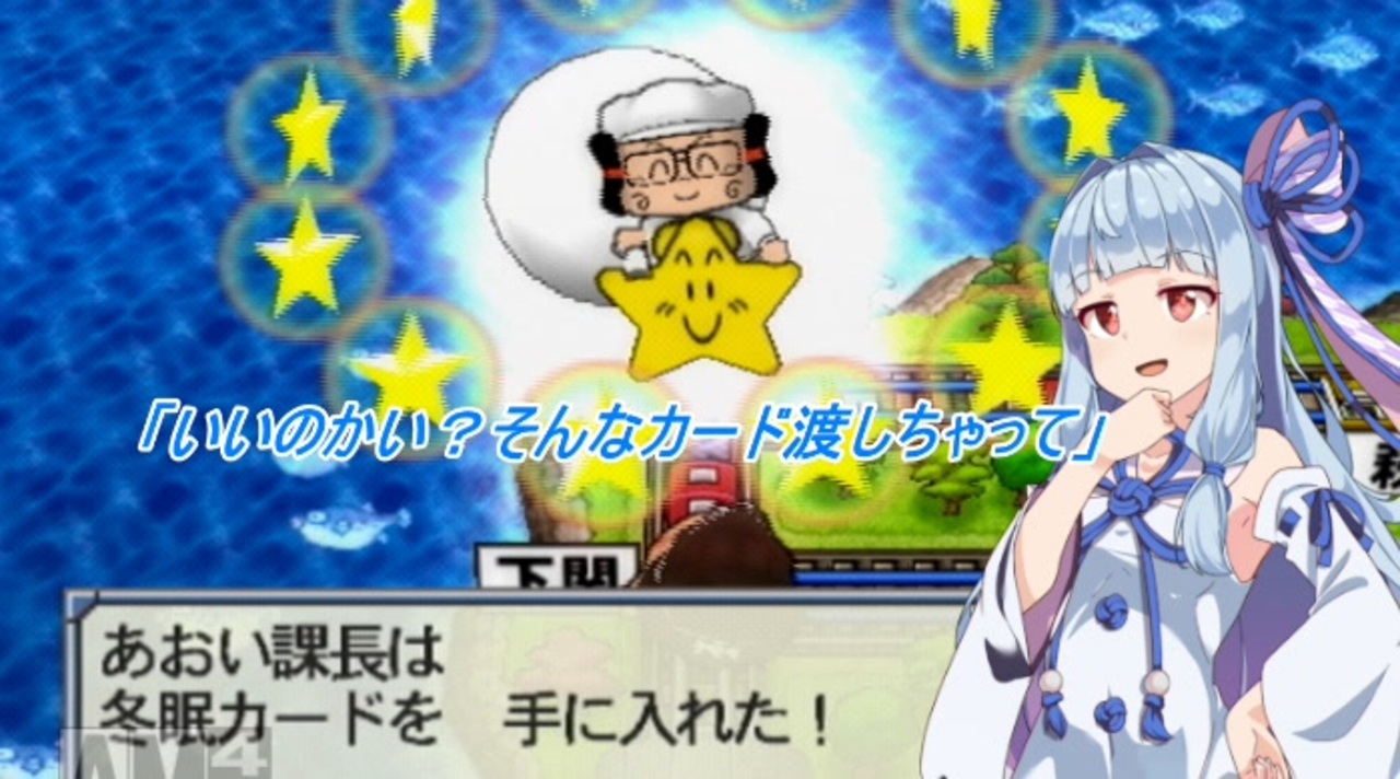 みんなトップになることを目標に動いてます。<br>思考時間長いため、今後もカット多用すると思います。<br><br>今回のルール<br>・北海道が四国の南に移動した次の年からの15年勝負。<br> それまではCPUさくまで放置。<br> 15年の決算時の総資産で勝敗を決める。<br>・禁止カード:「シルバー」「ゴールド」「プラチナ」「クレジット」<br>・物件イベントで入手した妨害系カードの使用禁止<br>(ここで言う妨害系とは、「武器よさらば」カードで消えるもの全てとなる。<br> 進行形やそれ以外の便利系は自由に使ってよい)<br>・決算後の4月、未行動者に対してお金に関するカードの使用禁止<br>(例1:1番目に行動する人は、4月に他者に対して「ベビキュラー」、「とっかえっこ」等の<br> カードを使用できない。<br> 例2:3番目に行動する人は、4月でも1番目・2番目の人に対して使用できるが、4番目の<br> 人には使用不可。<br> 例外として、「裸一貫」「たいらのまさ」カードはいつでも使用可能)<br>・リアルファイト禁止<br>・開始時の順位に応じて、総資産に倍率計算する。<br> 1位:1倍<br> 2位:1.2倍<br> 3位:1.8倍+開始5年間はシルバーカード使用可能<br> ビリ:3倍+開始10年間はシルバーカード使用可能<br>・特に触れてないものに関しては、一切制限がないものと思ってください。<br> <br><br>前→0年目<a href="https://www.nicovideo.jp/watch/sm37337000" class="watch">sm37337000</a><br>次→2年目<a href="https://www.nicovideo.jp/watch/sm37422447" class="watch">sm37422447</a><br>ボイロ電鉄16→<a href="https://www.nicovideo.jp/mylist/69236346" target="_blank" rel="noopener">mylist/69236346</a><br>他ボイロ実況part1→<a href="https://www.nicovideo.jp/mylist/64505817" target="_blank" rel="noopener">mylist/64505817</a><br>あんまり呟かないtwitter→<a href="https://twitter.com/LUNA50312496" target="_blank" rel="noopener nofollow">https://twitter.com/LUNA50312496</a>