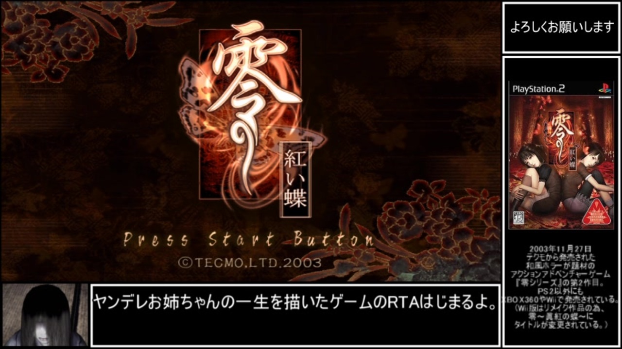 <span style="color: #ff0000; font-size: 24px;"><strong>再走しました⇒</strong></span><span style="color: #262626; font-size: 24px;"><strong><a href="https://www.nicovideo.jp/watch/sm37509585" class="watch">sm37509585</a></strong></span><br><br><br>Aviutlの音量調整バーがガバーっていたので初投稿です。<br>変更点ver1.10<br>・音量を調整しました。(茜ちゃんの怨霊を上げ、そのほかの音量を下げました。)<br>・射影機、キャラクターの解説を追加しました。<br>・浮遊霊、地縛霊の撮影難易度を追加しました。(7つ星で評価)<br>・本編終了後、役2分間の質問、要望コーナーを追加しました。<br>・エンコード時間短縮のため、ビットレートを少し下げました。<br>この他にもたくさんのアドバイスを頂いていましたが、次part以降に反映させていただきます。ありがとうございました!<br>淫無バージョンは要望があれば作成します。<br>以下part1の説明文と同文。<br><br><br>零~紅い蝶~の霊リストコンプRTAを走りました。初めての編集なのでガバ編集が目立つかもしれませんがお兄さん許して!<br><br>計測期間 難易度選択~霊リストコンプ確認後、ラスボス撃破後のリザルト画面(霊リストコンプ時にアナウンスがされないため、このような計測方法を取っています。)<br><br><br>ゲームスタート~一ノ刻終了まで。<br><br>part1→ここ part2→ないです。<br>このシリーズのマイリスト→<a href="https://www.nicovideo.jp/mylist/69331881" target="_blank" rel="noopener">mylist/69331881</a><br><br>まっしろ兄貴、かぎしっぽ兄貴、蒼猫兄貴、torururu兄貴、テン兄貴、カニタマ兄貴、太陽さん兄貴、KENT兄貴、MOKKOSS兄貴、しょっぱいもの兄貴、おじさん兄貴、Hraesvelgr兄貴、広告ありがとナス!