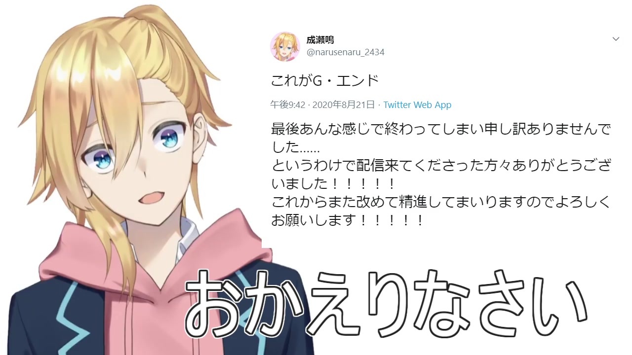 あえて言おう…おかえりなさい<br><br>〈配信元〉<br>成瀬鳴の今後の活動について<br><a href="https://www.youtube.com/watch?v=YygplEiBwR0" target="_blank" rel="noopener nofollow">https://www.youtube.com/watch?v=YygplEiBwR0</a><br><br>【実質初配信】自己紹介させていただきます。【#鳴OnLive】<br><a href="https://www.youtube.com/watch?v=RVpcVf86awk" target="_blank" rel="noopener nofollow">https://www.youtube.com/watch?v=RVpcVf86awk</a><br><br>成瀬鳴のYouTubeチャンネル↓<br><a href="https://www.youtube.com/channel/UCoM_XmK45j504hfUWvN06Qg?sub_confirmation=1" target="_blank" rel="noopener nofollow">https://www.youtube.com/channel/UCoM_XmK45j504hfUWvN06Qg?sub_confirmation=1</a><br>成瀬鳴のTwitter↓<br><a href="https://twitter.com/narusenaru_2434" target="_blank" rel="noopener nofollow">https://twitter.com/narusenaru_2434</a> <br>