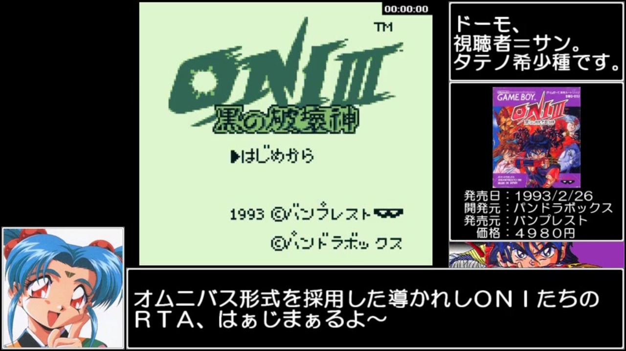 失踪していたので初投稿です。<br><br><span style="color: #000000;">ルールです。<br>・「はじめから」を押してからスタート<br>・エンディング後の社名が表示されたら計測終了<br>・参考RTAです。あしからず。<br><br>はじまり~第2章始まりまで<br>パート2→ </span><a href="https://www.nicovideo.jp/watch/sm37421927" class="watch">sm37421927</a><br><br>【参考にさせて頂いたサイト様】<br>・ゲームの里 様<br><a href="http://gesato.com/index.html" target="_blank" rel="noopener nofollow">http://gesato.com/index.html</a><br>・攻略大作戦 様<br><a href="http://way78.com/" target="_blank" rel="noopener nofollow">http://way78.com/</a><br><br>ONI RTAまとめ <a href="https://www.nicovideo.jp/mylist/64561876" target="_blank" rel="noopener">mylist/64561876</a><br><br>今までの投稿動画 <u><a href="https://www.nicovideo.jp/mylist/23798592" target="_blank" rel="noopener">mylist/23798592</a></u><br><br>Twitter→ <a href="https://twitter.com/AuraBattler777" target="_blank" rel="noopener nofollow">https://twitter.com/AuraBattler777</a>