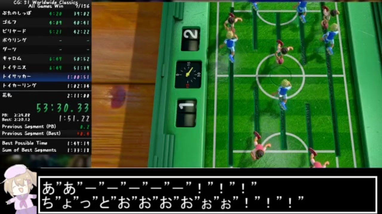 ※マイク音声を切り忘れたので、地声が入っています。<br><br>こんなに長く時間が空いての投稿は初投稿です。<br>この一か月、たくさんのことがありました。<br><br>2020/7/13の配信にて、世界初の2時間切りを達成したので動画投稿に至りました。<br>のんびり編集するのでよろしくね。<br><br>動画投稿時点で、Speedrun.com上の記録にて世界一位の記録になります。<br><br>計測開始:最初のゲームを選んだ瞬間<br>計測終了:最後のゲームのリザルトが表示された瞬間<br>カテゴリ:All Games Win<br>使用ハード:Nintendo Switch<br><br>運ゲーによるロスやガバは結構多いです。<br><br><a href="https://www.nicovideo.jp/watch/sm37200769" class="watch">sm37200769</a>←前 次→まだだよ<br><br><br>Twitch→<a href="https://www.twitch.tv/kmbyukarin" target="_blank" rel="noopener nofollow">https://www.twitch.tv/kmbyukarin</a><br><追記><br>配信版はこちら。<br>【<a href="https://www.twitch.tv/videos/678463464" target="_blank" rel="noopener nofollow">https://www.twitch.tv/videos/678463464</a> 】<br><br>Twitter→@khrn_love<br><br>立ち絵はこはる(Twitter:@koharu_Mykl)様に頂きました。