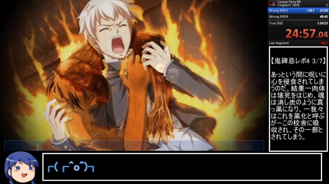 最終章なので初投稿です。<br><br>コープスパーティーブラッドカバーリピーティッドフィアー(PSP/日本語版)のChapter5 100%RTAです。<br><br>次 → <a href="https://www.nicovideo.jp/watch/sm37434197" class="watch">sm37434197</a><br><br>Chapter1 → <a href="https://www.nicovideo.jp/watch/sm37071734" class="watch">sm37071734</a><br>Chapter2 → <a href="https://www.nicovideo.jp/watch/sm37143143" class="watch">sm37143143</a><br>Chapter3 → <a href="https://www.nicovideo.jp/watch/sm37213176" class="watch">sm37213176</a><br>Chapter4 part1/2 → <a href="https://www.nicovideo.jp/watch/sm37308785" class="watch">sm37308785</a><br>Chapter4 part2/2 → <a href="https://www.nicovideo.jp/watch/sm37338244" class="watch">sm37338244</a><br><br><strong><a href="https://ec.nintendo.com/JP/ja/titles/70010000032976" target="_blank" rel="noopener nofollow">https://ec.nintendo.com/JP/ja/titles/70010000032976</a><br>↑Nintendo Switch版「コープスパーティーBlood Drive」が発売中です(ダウンロード版のみ)。難易度が少し下がったとのことなので、みんな、買おう!</strong><br><br>無編集版(youtube) → <a href="https://youtu.be/fcQxeaUEYF8" target="_blank" rel="noopener nofollow">https://youtu.be/fcQxeaUEYF8</a><br>twitter → <a href="https://twitter.com/41LANCER1" target="_blank" rel="noopener nofollow">https://twitter.com/41LANCER1</a><br><br>追記:<span style="font-size: 14px;">夏月ω兄貴、</span>藤林兄貴、<span style="font-size: 14px;">サムエル兄貴、テトアイス兄貴、</span>simo兄貴、月無 命兄貴、ティス兄貴、tatibana兄貴、ガンドラ兄貴、エデン兄貴、JJ10兄貴、baggio兄貴、RYU兄貴、baba兄貴、あさ兄貴、kamle兄貴、raiven3101兄貴、広告ありがとうございます!励みになります。<br>クソナガレポート先輩!?(右枠が)マズい(事になっているん)ですよ!持田哲志君、痴漢はやめようね!森繁朔太郎君は死因教えて?