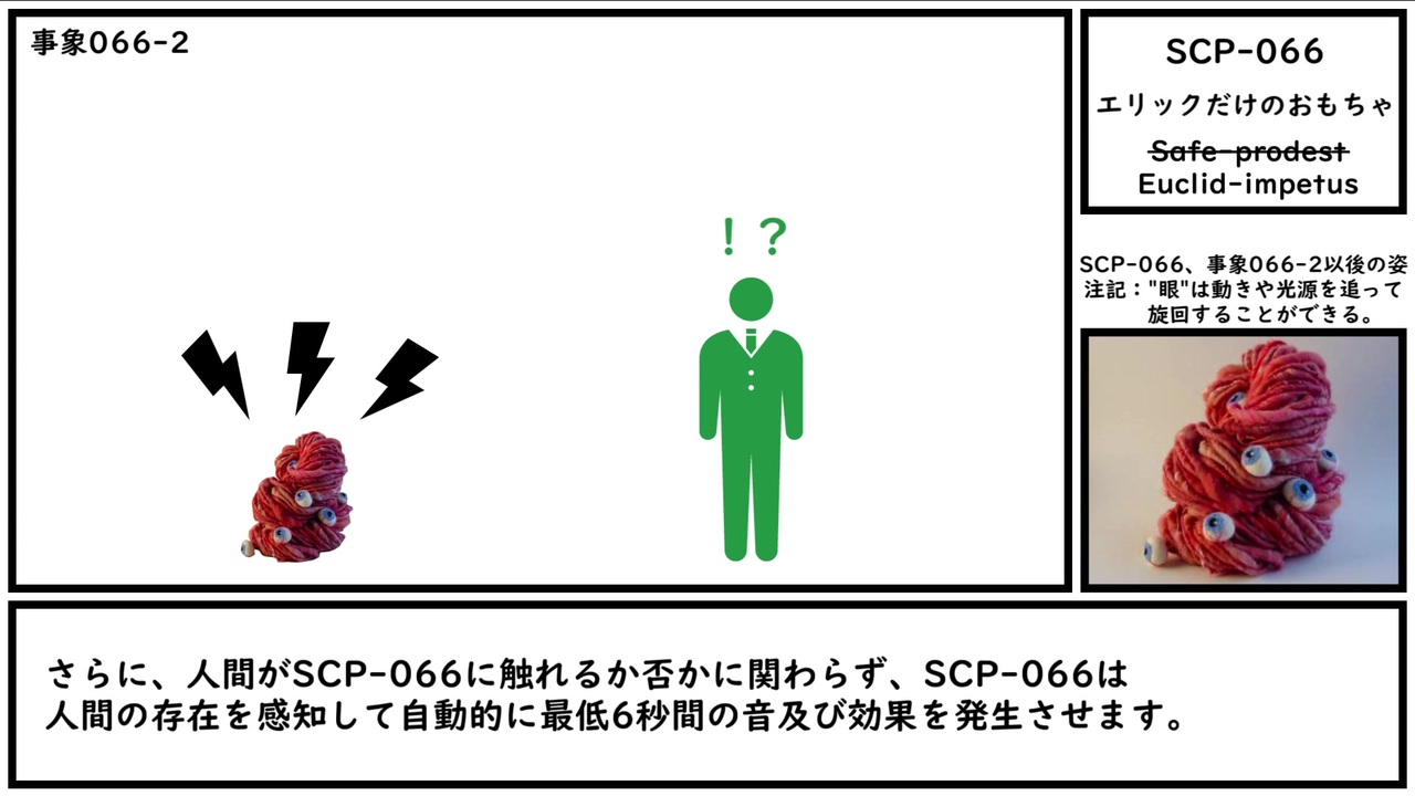 踊っている。跳ねている。弾んでいる。だから生きている。<br><br>本家記事 <a href="http://www.scp-wiki.net/scp-066" target="_blank" rel="noopener nofollow">http://www.scp-wiki.net/scp-066</a><br>翻訳記事 <a href="http://scp-jp.wikidot.com/scp-066" target="_blank" rel="noopener nofollow">http://scp-jp.wikidot.com/scp-066</a><br><span style="color: rgba(0, 0, 0, 0.87); font-size: 15px;">作者 </span><span style="color: #333333;">Communism will win</span><br><span style="color: rgba(0, 0, 0, 0.87); font-size: 15px;">SCP財団 <a href="http://scp-jp.wikidot.com" target="_blank" rel="noopener nofollow">http://scp-jp.wikidot.com</a></span><br><span style="color: #000000; font-size: 14px;">過去の動画はこちら </span><span style="color: #006699; font-size: 14px;"><a href="https://www.nicovideo.jp/mylist/67620202" target="_blank" rel="noopener">mylist/67620202</a></span><br><span style="color: rgba(0, 0, 0, 0.87); font-size: 15px;">CC-BY-SA 3.0</span>