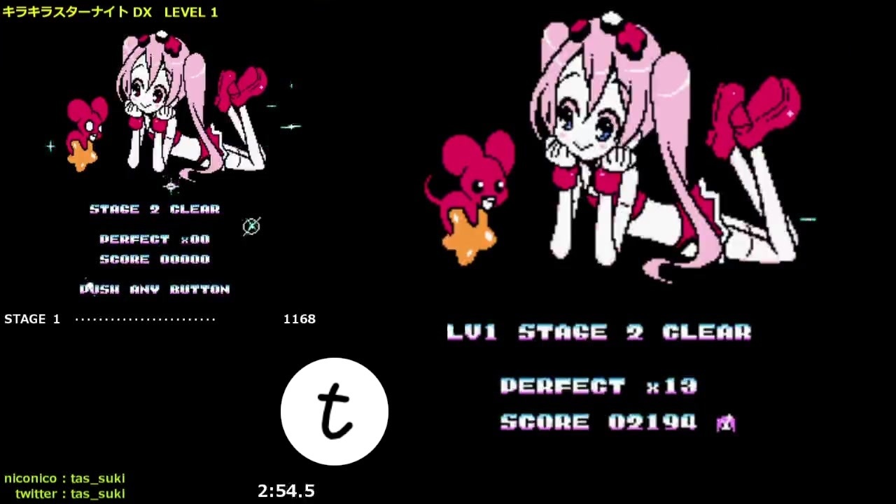 かわいい(かわいい)<br><br><br>スコアアタックです。1000近く更新できました。(嬉しい)<br><br>FC キラキラスターナイトDX の TAS の試走です。<br>ずっと作りたいと思っていた TAS の1つです。(嬉しい)<br><br>現行TAS (<a href="https://www.nicovideo.jp/watch/sm22230204" class="watch">sm22230204</a>, <strong>ものくろうさぎ</strong>氏, 2013/11, <span style="color: blue;">ノーマル版</span>) によると、<br>10358 とのことなので、948 だけスコアを更新できました。<br><br>なお画面左の比較動画は、旧ver.(ノーマル版)のものです。<br>DX版との背景等の差異を見たくて載せています。<span style="color: red;">操作はしていません。</span><br><br> フレーム数:44432f 追記数: 42797<br><br>[関連サイト]<br>キラキラスターナイト 公式サイト: <a href="http://kirakira-star-night.riki2riki.com/" target="_blank" rel="noopener nofollow">http://kirakira-star-night.riki2riki.com/</a><br><br>[関連動画]<br><a href="https://www.nicovideo.jp/watch/sm21497613" class="watch">sm21497613</a> キラキラスターナイト PV 第2弾 (<strong>RIKI</strong>氏, 2013/08)<br><a href="https://www.nicovideo.jp/watch/sm21365409" class="watch">sm21365409</a> キラキラスターナイト PV (<strong>RIKI</strong>氏, 2013/07)<br><a href="https://www.nicovideo.jp/watch/sm29793487" class="watch">sm29793487</a> ノーマル版・DX版 比較動画 (<strong>765_16</strong>氏, 2016/10)<br><br>[過去に投稿した ナイト なTAS動画]<br><a href="https://www.nicovideo.jp/watch/sm35398538" class="watch">sm35398538</a> FC ナイトガンダム物語<br><a href="https://www.nicovideo.jp/watch/sm28832793" class="watch">sm28832793</a> FC ナイトガンダム物語(同時押しなし)<br><a href="https://www.nicovideo.jp/watch/sm35995782" class="watch">sm35995782</a> FC ナイトガンダム物語2 光の騎士<br><a href="https://www.nicovideo.jp/watch/sm34333159" class="watch">sm34333159</a> SFC ナイトガンダム物語 大いなる遺産<br><a href="https://www.nicovideo.jp/watch/sm29563265" class="watch">sm29563265</a> SFC SDガンダム外伝2 円卓の騎士<br><a href="https://www.nicovideo.jp/watch/sm31859971" class="watch">sm31859971</a> GB 新ナイトガンダム物語<br><br /><br>------------- 以下 共通説明文 -------------<br><br><strong>PIXIV FANBOX や Amazon にて支援を募っています。よかったらぜひ。<br>FANBOX : <a href="https://www.fanbox.cc/@tas-suki" target="_blank" rel="noopener nofollow">https://www.fanbox.cc/@tas-suki</a><br>Wish List : <a href="https://www.amazon.co.jp/hz/wishlist/ls/3M57V3BKOO1N9" target="_blank" rel="noopener nofollow">https://www.amazon.co.jp/hz/wishlist/ls/3M57V3BKOO1N9</a></strong><br><br><strong>twitter : <a href="https://twitter.com/tas_suki" target="_blank" rel="noopener nofollow">https://twitter.com/tas_suki</a><br>RTA : <a href="https://www.speedrun.com/user/tas_suki" target="_blank" rel="noopener nofollow">https://www.speedrun.com/user/tas_suki</a></strong><br><br><span style="color: #20124d;"><strong>※ 2021/10 以降は、不定期に動画を投稿しています。</strong></span><br><br> ・Posted TASes (recently)<br>05/31 <a href="https://www.nicovideo.jp/watch/sm42293404" class="watch">sm42293404</a> (PC)<br>04/30 <a href="https://www.nicovideo.jp/watch/sm42136556" class="watch">sm42136556</a> (PC)<br>02/28 <a href="https://www.nicovideo.jp/watch/sm41812217" class="watch">sm41812217</a> (MD)<br>12/25 <a href="https://www.nicovideo.jp/watch/sm41553821" class="watch">sm41553821</a> (PC)<br>11/08 <a href="https://www.youtube.com/watch?v=Lj6N0bm3lyo" target="_blank" rel="noopener nofollow">https://www.youtube.com/watch?v=Lj6N0bm3lyo</a> (PC)<br>09/29 <a href="https://www.youtube.com/watch?v=gRelRaVcyQg" target="_blank" rel="noopener nofollow">https://www.youtube.com/watch?v=gRelRaVcyQg</a> (PC)<br>07/01 <a href="https://www.youtube.com/watch?v=28G366IdmPE" target="_blank" rel="noopener nofollow">https://www.youtube.com/watch?v=28G366IdmPE</a> (PC)<br>05/31 <a href="https://www.nicovideo.jp/watch/sm40538452" class="watch">sm40538452</a> (PC)<br><br> ・Posted TASes (2016/04 ~ )<br><a href="http://www.nicovideo.jp/user/56935712/video" target="_blank" rel="noopener nofollow">http://www.nicovideo.jp/user/56935712/video</a><br><br> ・Posted TASes that are the current fastest records<br><a href="https://www.nicovideo.jp/series/74250" target="_blank" rel="noopener nofollow">https://www.nicovideo.jp/series/74250</a>
