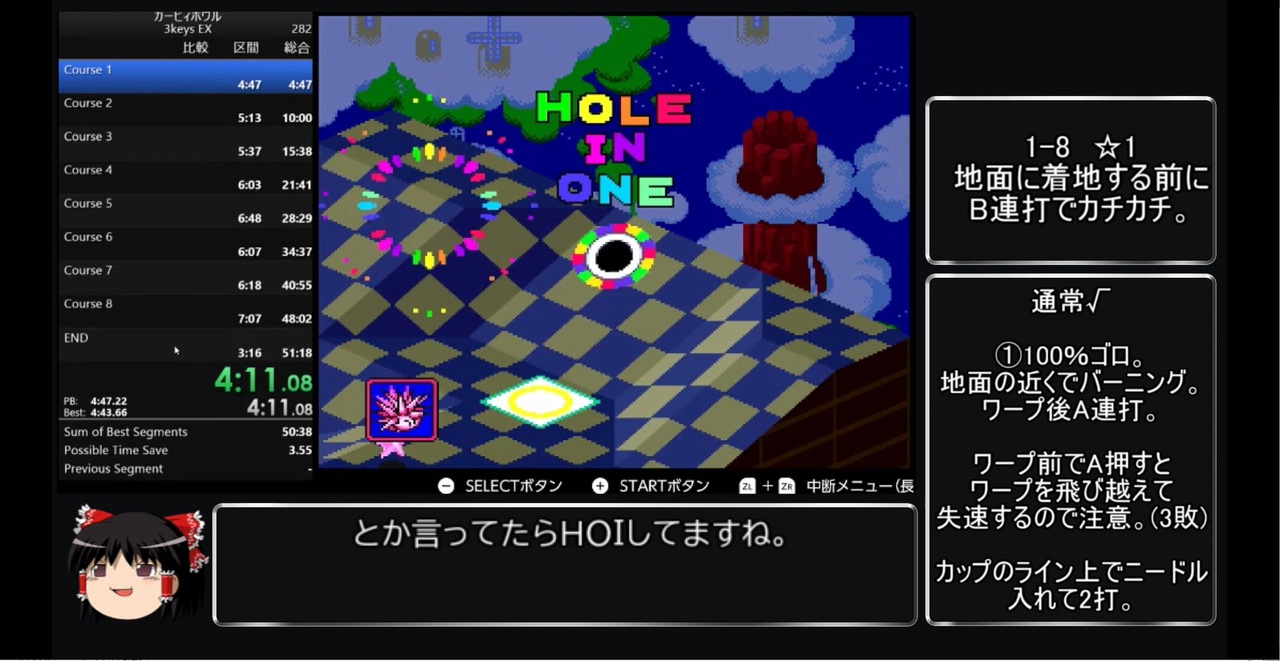 <span style="font-size: 16px;">世界一位姉貴から世界を奪い取りましたので</span>初投稿です。<br><br>計測区間:Course1に入るためのAボタンを押した瞬間~ENDが表示された瞬間<br>レギュレーション:↑,A,Bボタンのみ使用可能<br>プレイ環境:Nintendo Switch<br><br>有名なT.A.S動画である『3つのボタンでカービィボウル』シリーズが<br>元ネタになっておりますので、<br>ご覧になっていない方は是非一度そちらも視聴(履修)されることをオススメします。<br><br><span style="font-size: 14px;">初めての動画投稿で至らぬ点が多々あると思いますので、コメント欄で意見を述べていただけると助かります。<br><br>Part1→ここ Part2→</span><a href="https://www.nicovideo.jp/watch/sm37450592" class="watch">sm37450592</a><br><span style="font-size: 14px;">Part3→</span><a href="https://www.nicovideo.jp/watch/sm37457276" class="watch">sm37457276</a><span style="font-size: 14px;"> Part4→</span><a href="https://www.nicovideo.jp/watch/sm37465500" class="watch">sm37465500</a><br><br>Normal版Part1はこちら→<a href="https://www.nicovideo.jp/watch/sm37519744" target="_blank" rel="noopener nofollow">https://www.nicovideo.jp/watch/sm37519744</a><br><br><span style="font-size: 14px;">録ガバにより空気と化した前記録くんの動画→</span><a href="https://www.youtube.com/watch?v=Tjm_syn4W6c&t=834s" target="_blank" rel="noopener nofollow">https://www.youtube.com/watch?v=Tjm_syn4W6c&t=834s</a><br><br>コミュニティはこちら→<a href="https://com.nicovideo.jp/community/co3705247" target="_blank" rel="noopener nofollow">https://com.nicovideo.jp/community/co3705247</a><br>RTAの生放送とかやります<br><br>ツイッターはこちら→<a href="https://twitter.com/jinruinohaji" target="_blank" rel="noopener nofollow">https://twitter.com/jinruinohaji</a><br>3つのボタンでカービィボウルRTAのお問い合わせはこちらからどうぞ。<br>