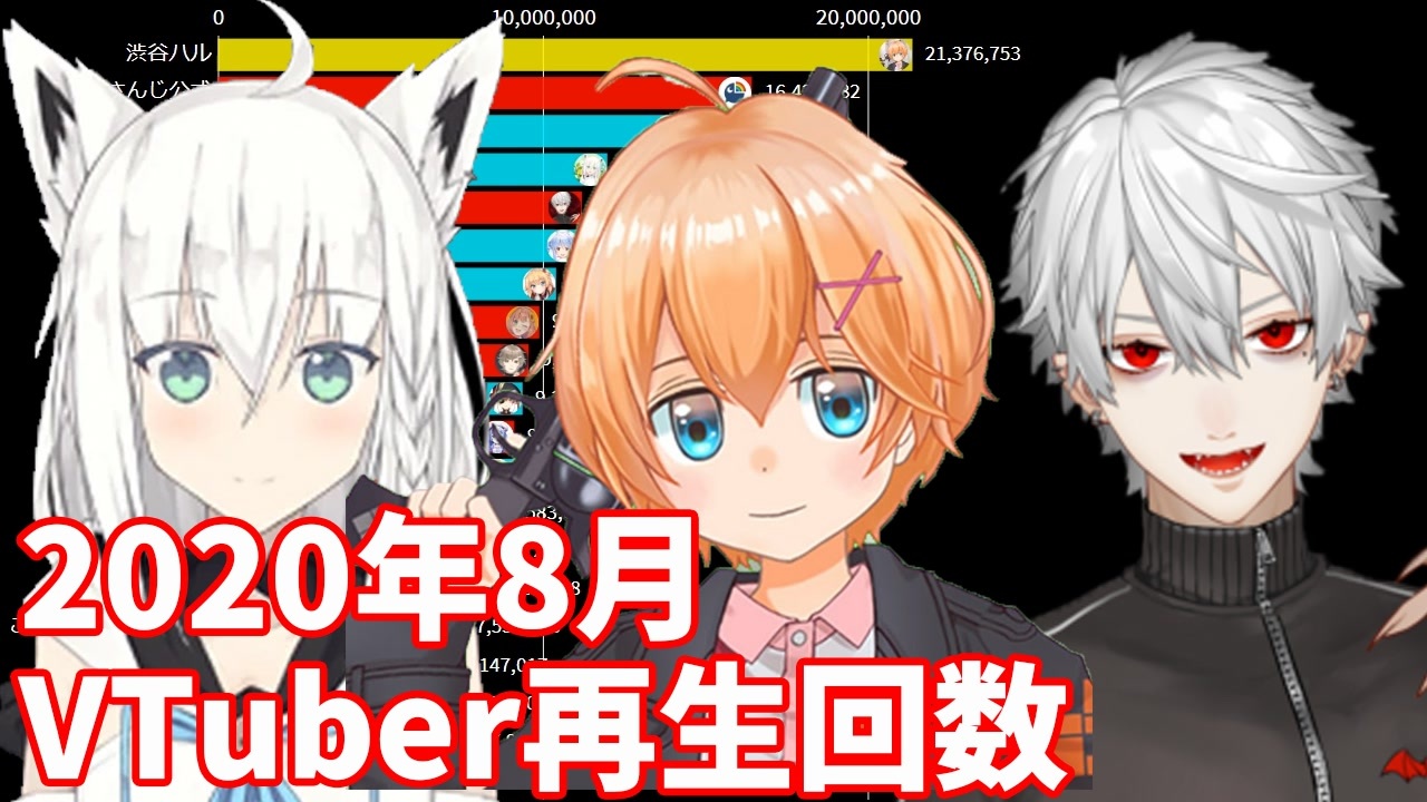 <span style="color: rgba(0, 0, 0, 0.87); font-size: 15px;">ホロライブやにじさんじなどに所属する日本のVTuberの2020年8月の再生回数ランキングです<br><br>※7月に権利対策でいくつかの動画を<br>非公開にして、8月以降に再公開していることが確認できた<br>一部ホロライブ系チャンネルの数値には補正を入れています。<br>具体的には↓のコミュニティ投稿をご覧いただければ<br><a href="https://www.youtube.com/post/Ugx42ZWl37HJ8QzhRhR4AaABCQ" target="_blank" rel="noopener nofollow">https://www.youtube.com/post/Ugx42ZWl37HJ8QzhRhR4AaABCQ</a></span><br><br>【APEX LEGENDS】VTuber最協決定戦<br><a href="https://www.youtube.com/watch?v=hfrOICSn9rQ" target="_blank" rel="noopener nofollow">https://www.youtube.com/watch?v=hfrOICSn9rQ</a><br>【ほろふぁいぶ】ホロライブ5期がデビュー!!本日よりTwitterにて活動開始!!<br><a href="https://www.youtube.com/watch?v=F76OBO9W7ZY" target="_blank" rel="noopener nofollow">https://www.youtube.com/watch?v=F76OBO9W7ZY</a><br>第1回 大乱闘スマブラ SPにじさんじ杯【にじさんじ大乱闘】<br><a href="https://www.youtube.com/watch?v=aj3rAPTPbyo" target="_blank" rel="noopener nofollow">https://www.youtube.com/watch?v=aj3rAPTPbyo</a><br>【超大型ゲスト出演】代表取締役、本気の道楽【 加賀美ハヤト3D 】<br><a href="https://www.youtube.com/watch?v=pgbe6rzkDZo" target="_blank" rel="noopener nofollow">https://www.youtube.com/watch?v=pgbe6rzkDZo</a><br>【にじさんじ甲子園】にじさんじ甲子園 決勝【パワプロ2020】<br><a href="https://www.youtube.com/watch?v=i55GH7l4Y0I" target="_blank" rel="noopener nofollow">https://www.youtube.com/watch?v=i55GH7l4Y0I</a><br>【3Dお披露目】異界の扉が開かれる でびるさま3D<br><a href="https://www.youtube.com/watch?v=ZsWEYac2UFg" target="_blank" rel="noopener nofollow">https://www.youtube.com/watch?v=ZsWEYac2UFg</a><br>【3Dお披露目配信 】アイドルマジシャンです!夜見3D<br><a href="https://www.youtube.com/watch?v=XZKIxpJQDuA" target="_blank" rel="noopener nofollow">https://www.youtube.com/watch?v=XZKIxpJQDuA</a><br><br><span style="color: rgba(0, 0, 0, 0.87); font-size: 15px;">BGM:Blue Destination/英雄伝説 閃の軌跡II オリジナルサウンドトラック/Copyright© Nihon Falcom Corporation<br>ファルコム音楽フリー宣言に基づき、日本ファルコムの音楽を利用しています<br><a href="https://www.falcom.co.jp/music-use" target="_blank" rel="noopener nofollow">https://www.falcom.co.jp/music-use</a><br><br>作者Twitter:<a href="https://twitter.com/michsuzu" target="_blank" rel="noopener nofollow">https://twitter.com/michsuzu</a></span>