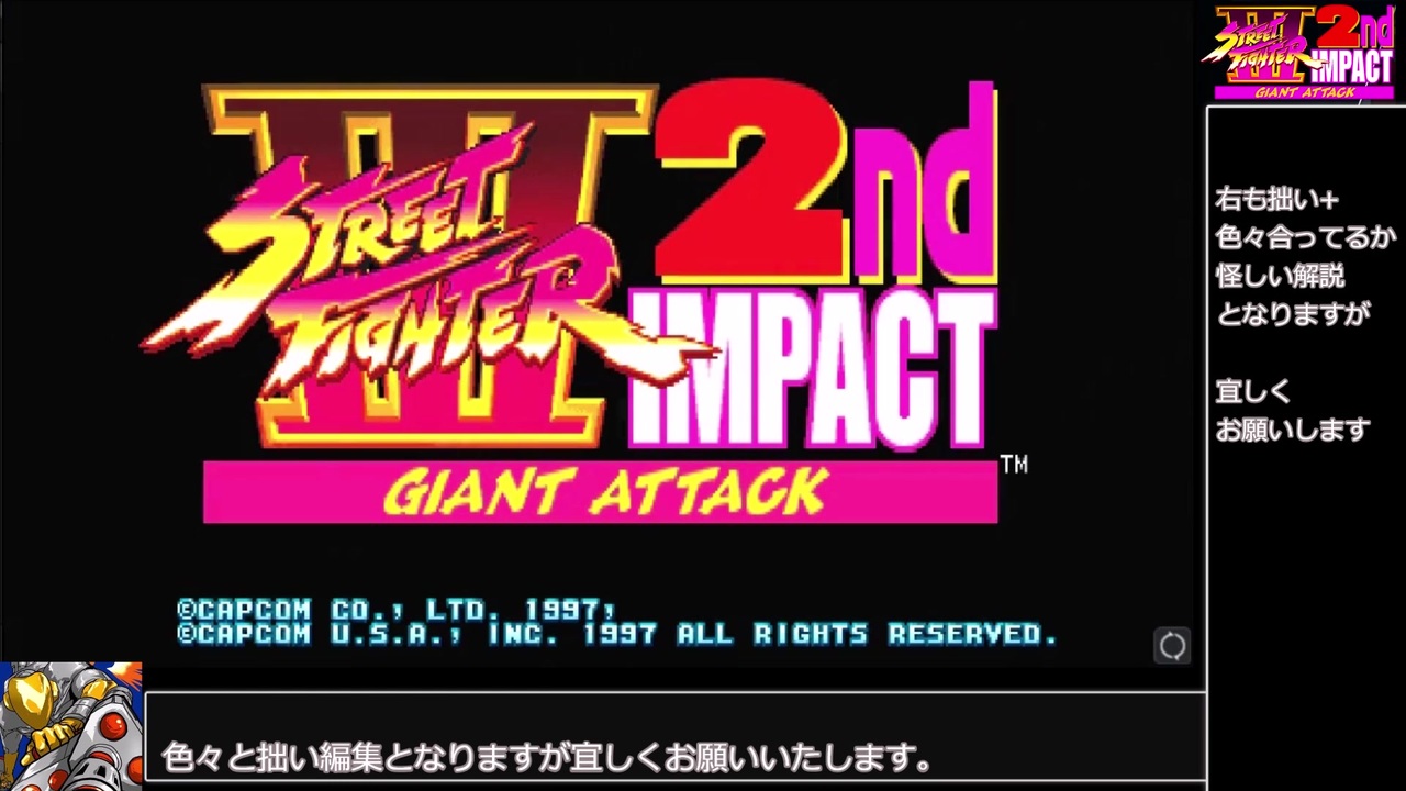ジャスティンに勝てる気がしないので初投稿です。<br>(20200202追記)ジャスティンと同着になりました。<br><a href="https://www.youtube.com/watch?v=bVPtkux05qc" target="_blank" rel="noopener nofollow">https://www.youtube.com/watch?v=bVPtkux05qc</a><br>でもボーナスゲームのレベル5固定技アドが大きいのでうん。<br>ともあれコメントで教えていただいた方ほんとにありがとうございます。<br>もうちょいいけそうなのでがんばります。<br><br>『ストリートファイターⅢ 2nd Impact -Giant Attack-』(カプコン,1997)RTA動画となります。<br>この前言ってたようにbiimシステム動画として作ってみました。<br><br>元動画:<a href="https://www.nicovideo.jp/watch/sm37209685" class="watch">sm37209685</a>と<a href="https://www.youtube.com/watch?v=LqAhkLpC4nY" target="_blank" rel="noopener nofollow">https://www.youtube.com/watch?v=LqAhkLpC4nY</a><br>この動画のつべばん:<a href="https://www.youtube.com/watch?v=R2H9knHqiXw" target="_blank" rel="noopener nofollow">https://www.youtube.com/watch?v=R2H9knHqiXw</a><br><br>システム動画として作成するのは初めてなので色々とご容赦しつつ見てもらえると幸いです。<br><br>制作環境:ゆっくりムービーメーカー4<br><br>広告:もみじ様、おりり様、ティガー様、マサ様、..様、pongiku様、白刹(ハク)様、悶絶様、クソ犬☆(栄養肉)様、さゆき様、橘ギャレン様、toto様、ショーン(´・ω・`) 様、ザナドゥ様、NRSG様、nimono様、㌦アーガの㌧様、baka様、ボーイッシュまみガチ恋勢様、august様、genza様、アルケイディ様、ふわふわさん様、Thomas様、gigi様、koufueq様、イノシシ様、わこう様、85shiki様、boomboomhead様、サディケル様、FRMB様、あかざき様、影満様、海千山千様、0501095abc様、ツカサ様、MSG様、幹部のペリーコロ様、スギ様、Souji様、奴隷獣タカ様、シュガーレス様、モンゴルピカチュウ様、おっぷる様、roadsports様、仮の人様、ゆうたん様、yu様、矢老様、井辻様、nimono様、Thomas様、vionanist様、Noron様、Lui様、ケジメニンジャ様、ドクロ様、重力海網敷-3rd様、笑い生活二十四時様、(以下省略させていただきます、すみません)広告ありがとうございます!<br><br>解説:<a href="https://vandalizer.hatenablog.jp/entry/2020/06/02/014134" target="_blank" rel="noopener nofollow">https://vandalizer.hatenablog.jp/entry/2020/06/02/014134</a><br>ユン動画:<a href="https://www.youtube.com/watch?v=SfDdo-6WRVI" target="_blank" rel="noopener nofollow">https://www.youtube.com/watch?v=SfDdo-6WRVI</a><br>ショーン動画:<a href="https://www.youtube.com/watch?v=ipO30sBCwrA" target="_blank" rel="noopener nofollow">https://www.youtube.com/watch?v=ipO30sBCwrA</a><br>豪鬼の対戦動画:<a href="https://www.nicovideo.jp/watch/sm32904291" class="watch">sm32904291</a>