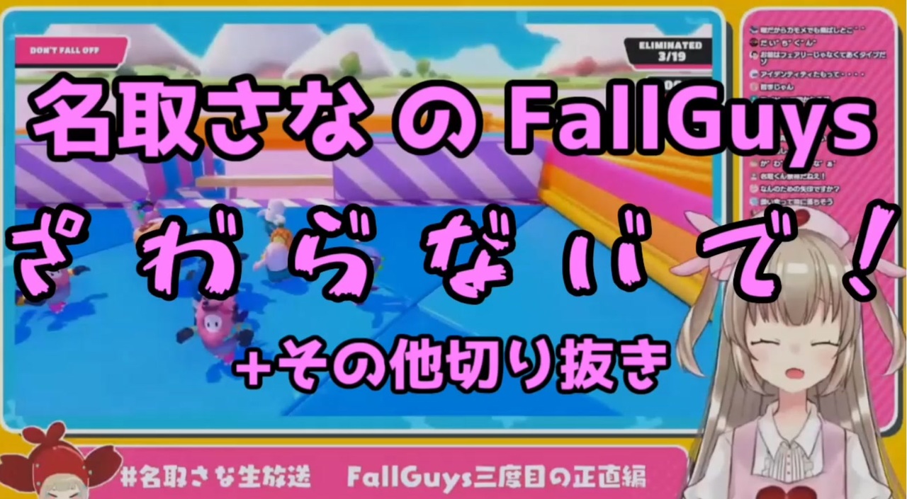 名取が楽しそうだと、こっちも笑顔になっちゃうな。<br>【追記】<br>クリエイター向けPC「DAIV」です……。<br>全く気付いておりませんでした。大変申し訳ありません。<br>広告ありがとうございます!<br>【2020/09/30 追記】<br>名取クラウンGET&チーム全員ファイナル出場おめでとう! #元気EEEEっぱい !<br><br>名取の魅力がぎゅっと詰まった元動画はこちら。(本動画は#1~3から切り取り抜粋)<br>#1【Fall Guys】初めてなのに、勝てちゃった!w<br><a href="https://www.youtube.com/watch?v=liiNyIyoYMU" target="_blank" rel="noopener nofollow">https://www.youtube.com/watch?v=liiNyIyoYMU</a><br><br>#2【FallGuys】競争社会に負けない名取さなちゃん奮闘記<br><a href="https://www.youtube.com/watch?v=jdBHgPi0oCc" target="_blank" rel="noopener nofollow">https://www.youtube.com/watch?v=jdBHgPi0oCc</a><br><br>#3【FallGuys】こんな醜い争い…名取は参加しませんよ!<br><a href="https://www.youtube.com/watch?v=7qn9KTp4l60" target="_blank" rel="noopener nofollow">https://www.youtube.com/watch?v=7qn9KTp4l60</a><br><br>効果音:魔王魂様、DOVA-SYNDROME様<br>画像素材:いらすとや様、他<br><br>「お経:魔王魂」で笑い過ぎて故人勢Vtuberになりかける名取さな<br><a href="https://www.nicovideo.jp/watch/sm37490766" class="watch">sm37490766</a>