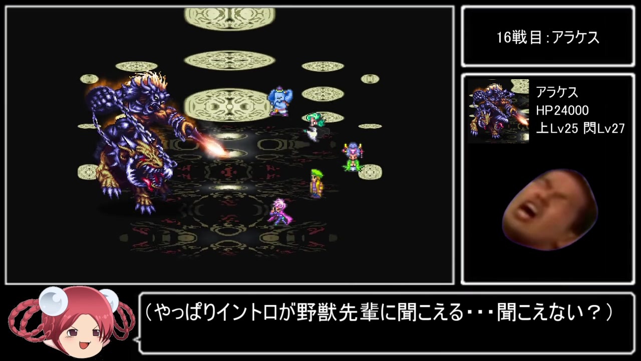 プレイ条件<br>1. 真・最少勝利回数クリア(退却・敗北なし)<br>2. 宝箱は回収しない<br>3. コマンダーモード・分身技・指輪転がしなし<br>4. 編集は頑張らない<br>※バグやサブフレームリセットを利用した戦闘回数削減はなし<br><br><a href="https://www.nicovideo.jp/watch/sm37429188" class="watch">sm37429188</a>←part5|part7→<a href="https://www.nicovideo.jp/watch/sm37502038" class="watch">sm37502038</a><br>part1→<a href="https://www.nicovideo.jp/watch/sm37231834" class="watch">sm37231834</a><br>再生リスト→<a href="https://www.nicovideo.jp/mylist/69126940" target="_blank" rel="noopener">mylist/69126940</a><br>おやつカンパニー(ニコ生)→co551055<br>生放送のアーカイブはこちら→<a href="https://www.youtube.com/playlist?list=PLrkOMyVpbtkeU5mpGfTc7sj6G_PXVsW57" target="_blank" rel="noopener nofollow">https://www.youtube.com/playlist?list=PLrkOMyVpbtkeU5mpGfTc7sj6G_PXVsW57</a><br><br>他の挑戦シリーズとか→<a href="https://www.nicovideo.jp/mylist/3220744" target="_blank" rel="noopener">mylist/3220744</a> <br>YouTube版→<a href="https://goo.gl/oey5Y7" target="_blank" rel="noopener nofollow">https://goo.gl/oey5Y7</a><br><br>© 1995, 2019 SQUARE ENIX CO., LTD. All Rights Reserved. Planned & Developed by ArtePiazza ILLUSTRATION: TOMOMI KOBAYASHI 当該作品の転載・配布は禁止いたします。<br>