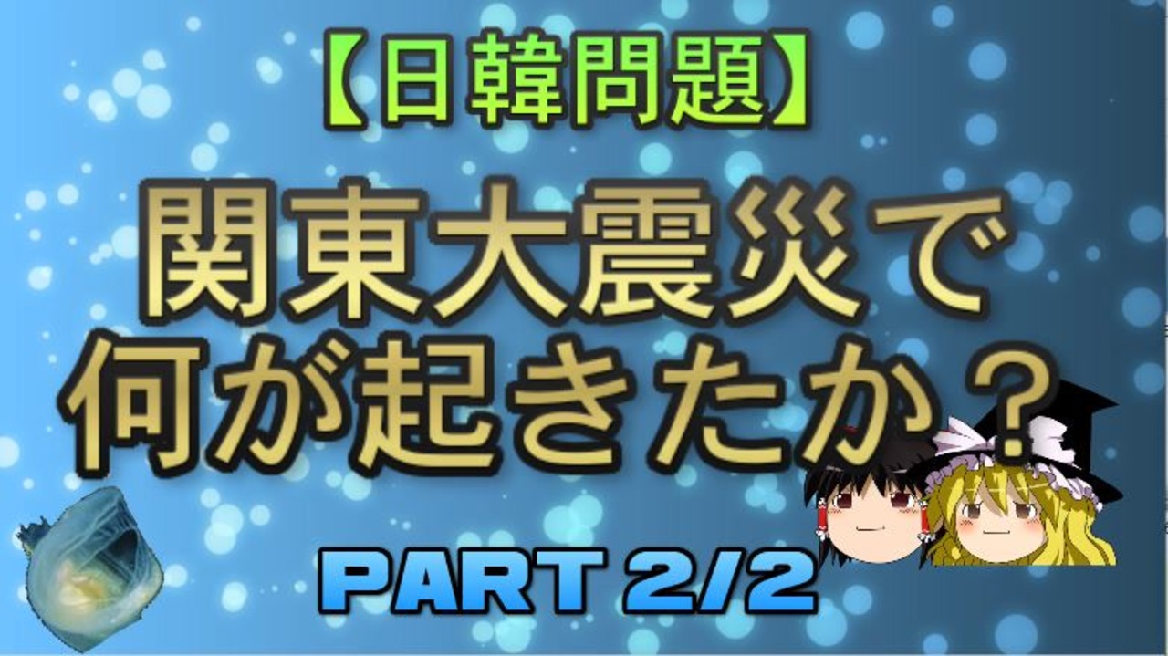 さて、本日は前回に引き続き関東大震災関連の問題を扱っていきます。<br>まだ土曜日だよ?<br><br>今回のブロマガ記事<br><a href="https://ch.nicovideo.jp/article/ar1941523" target="_blank" rel="noopener">ar1941523</a><br><br>元記事<br>関東大震災と朝鮮人虐殺事件の問題点<br><a href="https://ch.nicovideo.jp/article/ar1100098" target="_blank" rel="noopener">ar1100098</a><br><br>引用ソースと動画のテキストをブロマガ日韓問題(初心者向け)のほうへ掲載しています。<br><br>日韓問題(初心者向け)<br><a href="https://ch.nicovideo.jp/ooguchib/blomaga" target="_blank" rel="noopener nofollow">https://ch.nicovideo.jp/ooguchib/blomaga</a><br><br>暇つぶしにどうぞ<br><a href="http://ooguchib.blog.fc2.com/" target="_blank" rel="noopener nofollow">http://ooguchib.blog.fc2.com/</a> <br><br>twitter @ooguchib<br><a href="https://twitter.com/ooguchib" target="_blank" rel="noopener nofollow">https://twitter.com/ooguchib</a><br><br>前 <a href="https://www.nicovideo.jp/watch/sm37437649" class="watch">sm37437649</a> <a href="https://www.nicovideo.jp/mylist/59069876" target="_blank" rel="noopener">mylist/59069876</a> 次回 <a href="https://www.nicovideo.jp/watch/sm37510532" class="watch">sm37510532</a><br><br>番外編マイリスト<br><a href="https://www.nicovideo.jp/mylist/62992608" target="_blank" rel="noopener">mylist/62992608</a><br><br>YouTube版<br><a href="https://youtu.be/Gcgb9bOAIX8" target="_blank" rel="noopener nofollow">https://youtu.be/Gcgb9bOAIX8</a>