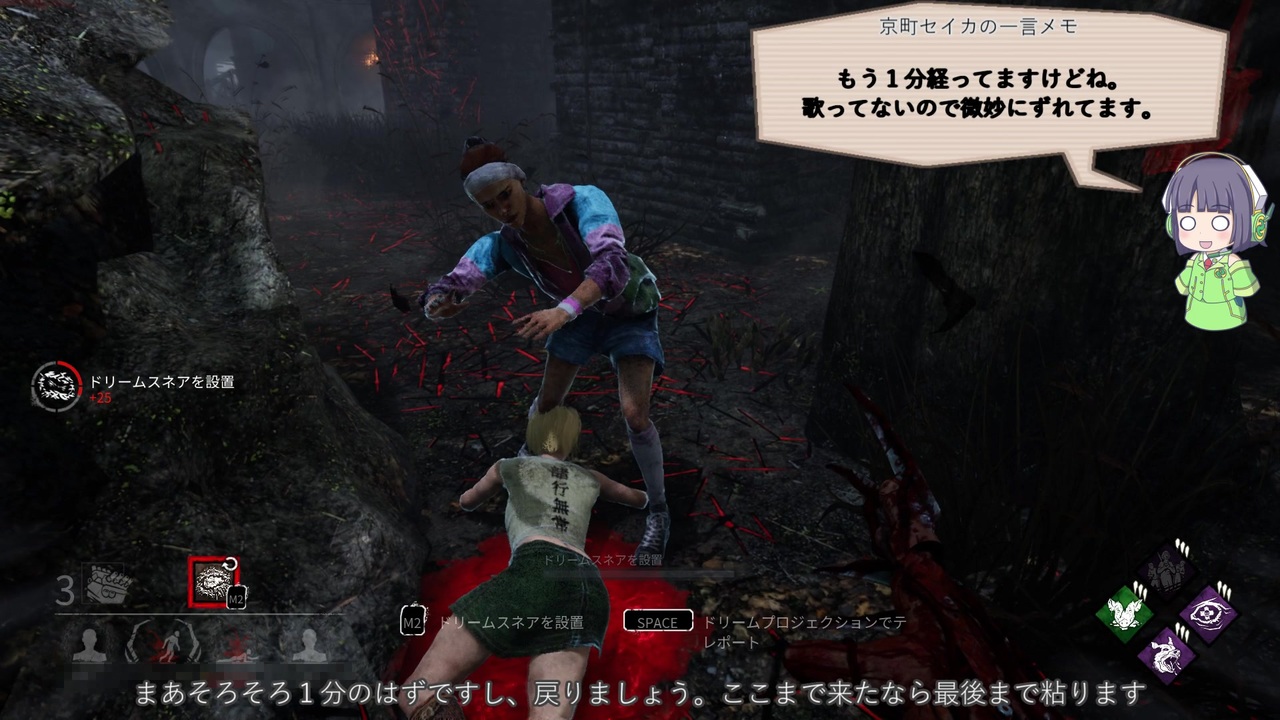 残残残忍<br><br><a href="https://www.nicovideo.jp/watch/sm37328964" class="watch">sm37328964</a>←前回 リスト <a href="https://www.nicovideo.jp/mylist/62705262" target="_blank" rel="noopener">mylist/62705262</a> 次回→<a href="https://www.nicovideo.jp/watch/sm37573669" class="watch">sm37573669</a><br><br>うっかり這いずり放置を多用しすぎると評価が大変なことになります<br>どうあがいても残忍<br><br>以下パーク説明という名のコピペ<br><br>・看護婦の使命<br>20・24・28m以内で治療をしている生存者と治療されている生存者のオーラを可視化する。<br><br>・ずさんな肉屋<br>生存者に攻撃を与えると効果発動<br>生存者の出血痕が残る頻度が少し・普通・大きく上昇<br>更に重傷状態(治療速度-20%)を付与する。<br>この重傷状態は治療を終えると解除される。<br>(負傷状態から這いずり状態にした場合、この重傷状態の効果は重複しない)<br><br>・血の追跡者<br>まるで猟犬のように、遠距離でも血の匂いを追跡できる。<br>新鮮な血痕が、かなり識別できるようになり、血痕が残る時間が2・3・4秒増える<br><br>・デスバウンド<br>闇の中で人生が重なり合った者たちは、共に苦しむ宿命にある。<br>殺人鬼から32m以上離れた場所で生存者が別の生存者を治療して1段階回復させると、治療を施した側の生存者が叫んで位置が判明し、60秒間デスバウンドが発動する。<br>発動中、その生存者は治療した生存者から16/12/8m以上離れると忘却のステータス効果に苦しむ。<br><br>・血の共鳴<br>1人の生存者をフックに吊るすと、その他の負傷した生存者は治療されるまで出血効果に苦しみ、<br>疲労効果が45秒間続く。<br>このパークの再使用には80・70・60秒必要。<br>