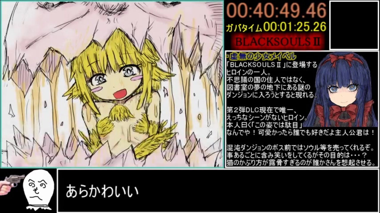 <span style="color: #9900ff; font-size: 18px;"><strong>知っていた……。<br>神なんて、RTAにはいない事を……<br>たとえいたとしても、我々走者を救う手を差し伸べてはくれないのだと<br>ああ……。何故なのですか?何故我々走者を見捨てるのですか?<br>こんなにも神に祈ってきた我々がいつも雑にガバる<br>……何故?<br>何故何故何故なんでなんでなんでなんでぇええええっ!?<br>神ぃいいいいッ!!いるのならガバ運を無くせェエェエェぇぇッッ!!</strong></span><br><br>胞子の森で深呼吸しながら作りました。<br><span style="color: #b7b7b7; font-size: 10px;">自分でも何作ってるのかこれもうわかんねぇな</span><br>作ったブラソRTA動画置場はこちら <a href="https://www.nicovideo.jp/mylist/64165275" target="_blank" rel="noopener">mylist/64165275</a><br>前→<a href="https://www.nicovideo.jp/watch/sm36762237" class="watch">sm36762237</a><br>次→<a href="https://www.nicovideo.jp/watch/sm39083867" class="watch">sm39083867</a><br><br><span style="color: #ff0000;"><strong>Q. どんどん投稿間隔が開いていってるけど次はいつになんのこれ</strong></span><br><strong>A.第3弾DLCには間に合わせます。ワタシヲシンジテクダサイ</strong><br><span style="color: #ff0000;"><strong>Q.なんかごちゃごちゃしてて見づらいんだけど</strong></span><br><strong>A.申し訳ありません、次回まではこんな感じを予定してます。<br> 第3弾DLC以降は真面目なbiimシステム動画を作るつもりです。<br><br>BLACKSOULSⅡ 愛しい貴方へ贈る不思議の国</strong><br><a href="https://www.dlsite.com/maniax/work/=/product_id/RJ237469.html" target="_blank" rel="noopener nofollow">https://www.dlsite.com/maniax/work/=/product_id/RJ237469.html</a> <br><strong>BLACKSOULS 黒の童話と五魔姫</strong><br><a href="https://www.dlsite.com/maniax/work/=/product_id/RJ203687.html" target="_blank" rel="noopener nofollow">https://www.dlsite.com/maniax/work/=/product_id/RJ203687.html</a> <br><strong>紅ずきんの森</strong><br><a href="https://www.dlsite.com/maniax/work/=/product_id/RJ185696.html" target="_blank" rel="noopener nofollow">https://www.dlsite.com/maniax/work/=/product_id/RJ185696.html</a><br><br><strong>神を信じる人と信じない人が、似た結末を迎えるようなゲームです。</strong><br><span style="color: #9900ff;">私達には神がついておられます</span>