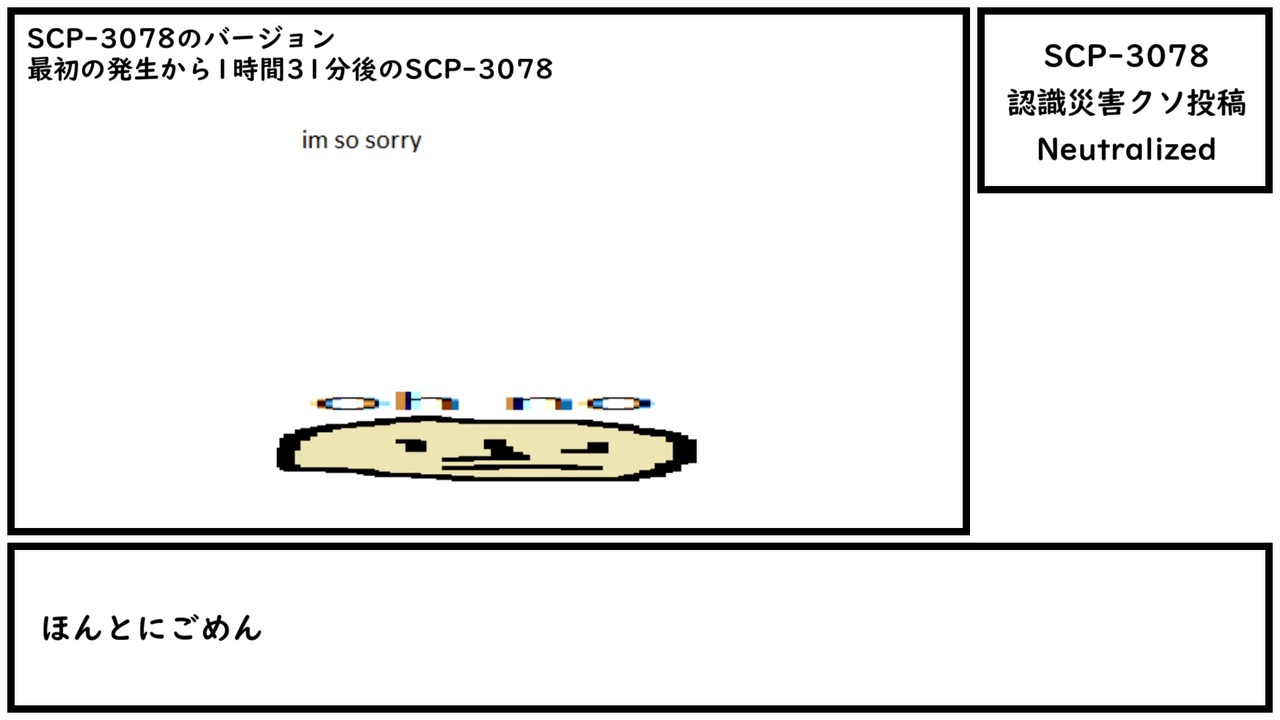 本当にタチの悪いイタズラは心のこもった謝罪さえも裏目になるもので、手に負えない。<br><br>本家記事 <a href="http://www.scp-wiki.net/scp-3078" target="_blank" rel="noopener nofollow">http://www.scp-wiki.net/scp-3078</a><br>翻訳記事 <a href="http://scp-jp.wikidot.com/scp-3078" target="_blank" rel="noopener nofollow">http://scp-jp.wikidot.com/scp-3078</a><br><span style="color: rgba(0, 0, 0, 0.87); font-size: 15px;">作者 </span>UsernameAlias<br><span style="color: rgba(0, 0, 0, 0.87); font-size: 15px;">SCP財団 <a href="http://scp-jp.wikidot.com" target="_blank" rel="noopener nofollow">http://scp-jp.wikidot.com</a></span><br><span style="color: #000000; font-size: 14px;">過去の動画はこちら </span><span style="color: #006699; font-size: 14px;"><a href="https://www.nicovideo.jp/mylist/67620202" target="_blank" rel="noopener">mylist/67620202</a></span><br><span style="color: rgba(0, 0, 0, 0.87); font-size: 15px;">CC-BY-SA 3.0</span>