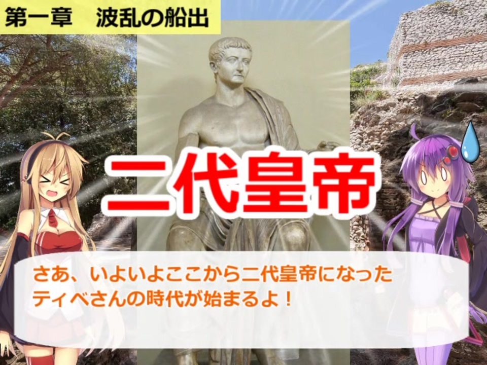 世界史に名を遺した偉大な初代皇帝の後を引き継ぐことになってしまった男。<br>そんな二代皇帝ティベリウスの孤独と悲哀に満ちた物語になります。<br>個人的には一番好きなローマ皇帝です♪<br><br>今回は、<strong>サミャーヴォさん</strong> (<a href="https://www.nicovideo.jp/user/66657057" target="_blank" rel="noopener">user/66657057</a>) 、<strong>エレミアさん</strong> (<a href="https://www.nicovideo.jp/user/948964" target="_blank" rel="noopener">user/948964</a>)<br>古代ローマ動画を投稿されている御二方との<span style="color: #ff0000;"><strong>「トリプル同時投稿コラボ」</strong></span>でございます!!<br>コラボ先の動画も是非御覧ください!<br><br>●【ローマの性】豊かなるアカリアはローマ文明を学び伝える【VOICEROID解説】Ex <a href="https://www.nicovideo.jp/watch/sm37489690" class="watch">sm37489690</a> <br>●結月ゆかりの洋書解説 番外編 『ローマのはじまり』 <a href="https://www.nicovideo.jp/watch/sm37489652" class="watch">sm37489652</a><br><br><a href="#" class="seekTime" data-seekTime="0:00" onclick="seekNicoPlayer('#0:00'); return false;">#0:00</a> プロローグ・導入 <a href="#" class="seekTime" data-seekTime="1:50" onclick="seekNicoPlayer('#1:50'); return false;">#1:50</a> 序章 名門貴族の災難 (前回のおさらい)<br><a href="#" class="seekTime" data-seekTime="9:16" onclick="seekNicoPlayer('#9:16'); return false;">#9:16</a> 第一章 波乱の船出 <a href="#" class="seekTime" data-seekTime="13:52" onclick="seekNicoPlayer('#13:52'); return false;">#13:52</a> 第二章 二代皇帝の課題<br><a href="#" class="seekTime" data-seekTime="18:39" onclick="seekNicoPlayer('#18:39'); return false;">#18:39</a> 第三章 ゲルマニアの後始末 <a href="#" class="seekTime" data-seekTime="22:34" onclick="seekNicoPlayer('#22:34'); return false;">#22:34</a> 第四章 期待の「皇太子」<br><a href="#" class="seekTime" data-seekTime="30:33" onclick="seekNicoPlayer('#30:33'); return false;">#30:33</a> 第五章 カプリ隠棲 <a href="#" class="seekTime" data-seekTime="36:04" onclick="seekNicoPlayer('#36:04'); return false;">#36:04</a> エピローグ<br><br>●part1 (帝国の誕生) → <a href="https://www.nicovideo.jp/watch/sm36166102" class="watch">sm36166102</a> <a href="https://www.nicovideo.jp/watch/sm36802962" class="watch">sm36802962</a> 後編 → <a href="https://www.nicovideo.jp/watch/sm38025503" class="watch">sm38025503</a><br>前シリーズpart1 (ローマ建国) → <a href="https://www.nicovideo.jp/watch/sm31041225" class="watch">sm31041225</a><br><br>●ローマ帝国解説リスト → <a href="https://www.nicovideo.jp/mylist/59073700" target="_blank" rel="noopener">mylist/59073700</a><br> いのっちコミュニティ co3096574 ついったー @inocchi_0515<br><br><span style="color: #ff0000;">●いのっちHP!</span> → <a href="https://inocchi-douga.com/" target="_blank" rel="noopener nofollow">https://inocchi-douga.com/</a><br>