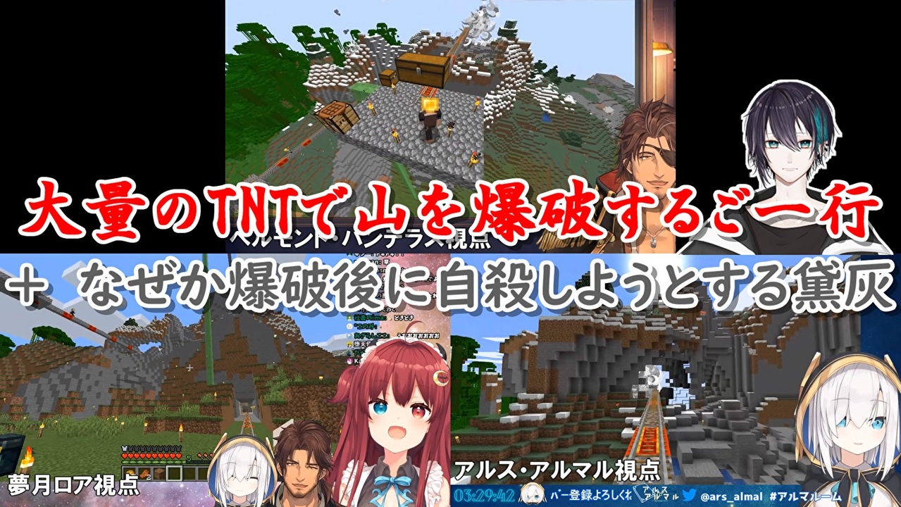 相変わらずものすげぇ爆破規模<br>そして黛は骨の髄までエンターテイナーなんやなって<br><br>本家参考動画<br>・ベルモンド・バンデラス<br>【Minecraft】新たな砂漠を目指して冒険【にじさんじ鯖】<br><a href="https://youtu.be/jqRGixC2aG0" target="_blank" rel="noopener nofollow">https://youtu.be/jqRGixC2aG0</a><br>・夢月ロア<br>【マイクラ】爆破決行【夢月ロア】<br><a href="https://youtu.be/ORpPaHGqHqQ" target="_blank" rel="noopener nofollow">https://youtu.be/ORpPaHGqHqQ</a><br>・アルス・アルマル<br>#22【Minecraft~にじ鯖~】TNT3000個の威力みせてもらおうか!! season2 【アルス・アルマル/にじさんじ】<br><a href="https://youtu.be/9Ze1dhMHVDM" target="_blank" rel="noopener nofollow">https://youtu.be/9Ze1dhMHVDM</a><br>・黛灰<br>【マイクラにじ鯖】釣雑談【黛 灰 / にじさんじ】<br><a href="https://youtu.be/x7uYDP10SEo" target="_blank" rel="noopener nofollow">https://youtu.be/x7uYDP10SEo</a><br><br>参考元チャンネル&Twitter<br>・ベルモンド・バンデラス<br><a href="https://www.youtube.com/channel/UCbc8fwhdUNlqi-J99ISYu4A" target="_blank" rel="noopener nofollow">https://www.youtube.com/channel/UCbc8fwhdUNlqi-J99ISYu4A</a><br><a href="https://twitter.com/belmond_b_2434" target="_blank" rel="noopener nofollow">https://twitter.com/belmond_b_2434</a><br>・夢月ロア<br><a href="https://www.youtube.com/channel/UCCVwhI5trmaSxfcze_Ovzfw" target="_blank" rel="noopener nofollow">https://www.youtube.com/channel/UCCVwhI5trmaSxfcze_Ovzfw</a><br><a href="https://twitter.com/yuzuki_roa" target="_blank" rel="noopener nofollow">https://twitter.com/yuzuki_roa</a><br>・アルス・アルマル<br><a href="https://www.youtube.com/channel/UCdpUojq0KWZCN9bxXnZwz5w" target="_blank" rel="noopener nofollow">https://www.youtube.com/channel/UCdpUojq0KWZCN9bxXnZwz5w</a><br><a href="https://twitter.com/ars_almal" target="_blank" rel="noopener nofollow">https://twitter.com/ars_almal</a><br>・黛灰<br><a href="https://www.youtube.com/channel/UCb5JxV6vKlYVknoJB8TnyYg" target="_blank" rel="noopener nofollow">https://www.youtube.com/channel/UCb5JxV6vKlYVknoJB8TnyYg</a><br><a href="https://twitter.com/mayuzumi_X" target="_blank" rel="noopener nofollow">https://twitter.com/mayuzumi_X</a><br><br>ニコニコのダイコンマンリスト<br>「バーチャルYouTuberシリーズ」↓<br><a href="https://www.nicovideo.jp/mylist/62551838" target="_blank" rel="noopener">mylist/62551838</a><br>「バーチャルYouTuberシリーズ2」↓<br><a href="https://www.nicovideo.jp/mylist/67858437" target="_blank" rel="noopener">mylist/67858437</a><br><br>YouTubeのダイコンマンチャンネル<br><a href="https://www.youtube.com/channel/UCkpfR11cG2kk9KTJijWCJfg" target="_blank" rel="noopener nofollow">https://www.youtube.com/channel/UCkpfR11cG2kk9KTJijWCJfg</a><br><br>ダイコンマンのTwitter<br><a href="https://twitter.com/Daikon_Man_V" target="_blank" rel="noopener nofollow">https://twitter.com/Daikon_Man_V</a>