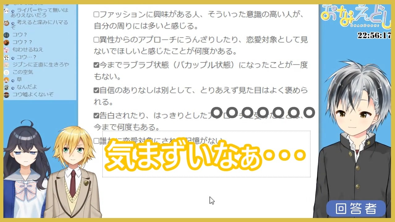 コウ、お前…<br><br><br>元動画はこちら<br>↓鈴木勝さん<br>【おなえどしコラボ】OD組と心理テスト ~そんなもんに俺たちの心が読まれるはずがない~<br><a href="https://www.youtube.com/watch?v=wOYuRZvfnO8" target="_blank" rel="noopener nofollow">https://www.youtube.com/watch?v=wOYuRZvfnO8</a><br><br>↓3人の歌ってみた動画<br><a href="https://www.youtube.com/watch?v=ws7f55ABWjE&feature=youtu.be" target="_blank" rel="noopener nofollow">https://www.youtube.com/watch?v=ws7f55ABWjE&feature=youtu.be</a><br><br><span style="color: rgba(0, 0, 0, 0.87); font-size: 15px;">↓Youtube version</span><br><a href="https://www.youtube.com/watch?v=i3QGBTw-fWo" target="_blank" rel="noopener nofollow">https://www.youtube.com/watch?v=i3QGBTw-fWo</a><br><br><br />-----------------------------------------------------------------------------------------------------------------<br>※2020.12よりTwitter、Youtube、ニコニコ動画のアカウント名統一しました。宜しくお願いします。<br><br>↓【Twitter】<br><a href="https://twitter.com/takatora1609" target="_blank" rel="noopener nofollow">https://twitter.com/takatora1609</a><br><br>↓【Youtube】<br><a href="https://www.youtube.com/channel/UCF1LewVuWtwy27KpmLgpcdw" target="_blank" rel="noopener nofollow">https://www.youtube.com/channel/UCF1LewVuWtwy27KpmLgpcdw</a><br><br>↓【他にもにじさんじの切り抜き動画もあげてるので見てね】<br><a href="https://www.nicovideo.jp/series/111772?ref=user_series" target="_blank" rel="noopener nofollow">https://www.nicovideo.jp/series/111772?ref=user_series</a><br><br>↓【主な効果音(効果音ラボさん)】<br><a href="http://noiselessworld.net/" target="_blank" rel="noopener nofollow">http://noiselessworld.net/</a><br><br>↓【BGM(鏡の境界)】<br><a href="https://www.nicovideo.jp/watch/sm36172514" class="watch">sm36172514</a><br>