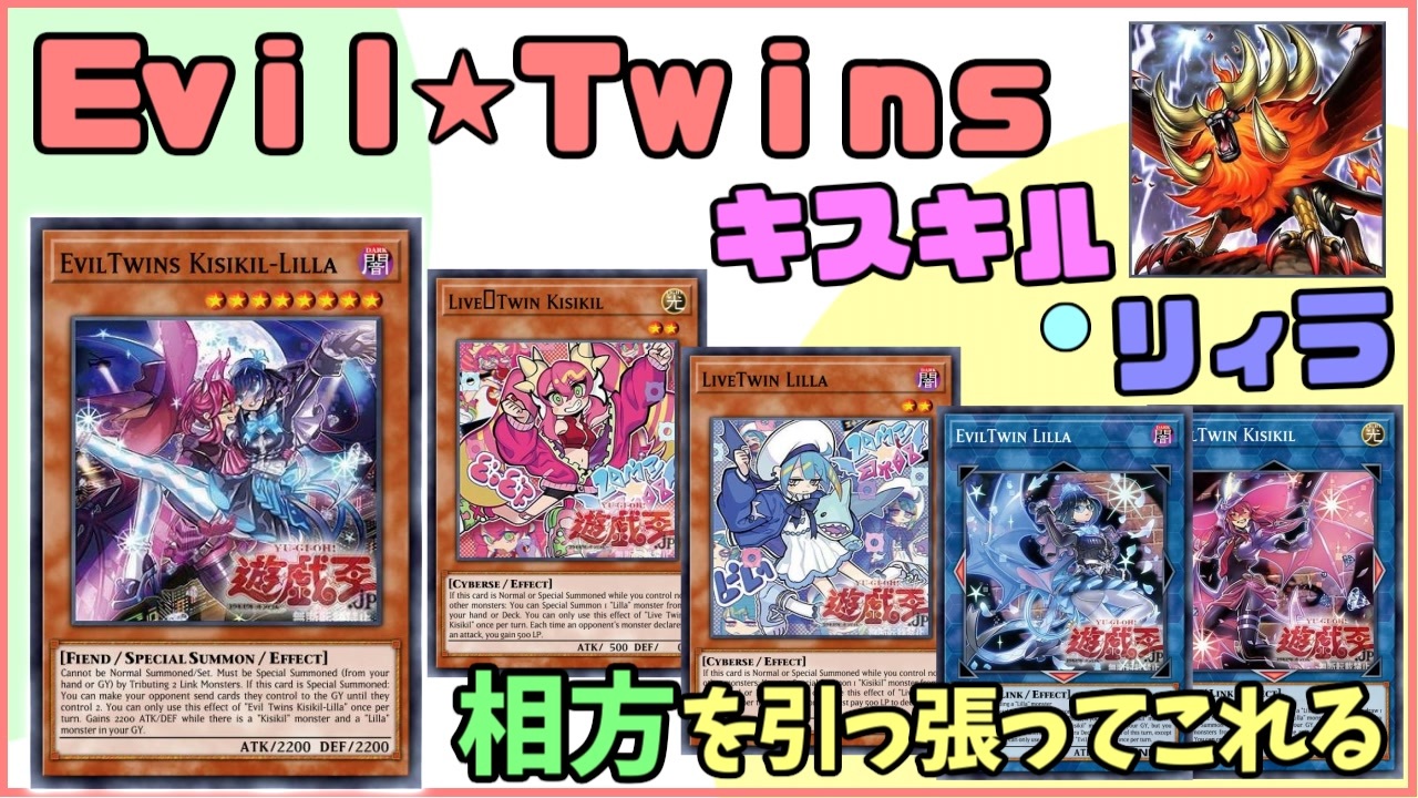 <strong>デッキビルドパック ジェネシス・インパクターズ</strong>で登場<br>新テーマ <span style="color: #e69138; font-size: 24px;"><strong>Evil★Twins</strong></span><br><span style="color: #e06666; font-size: 16px;"><strong>キスキル</strong></span><span style="font-size: 16px;">と</span><span style="color: #3c78d8; font-size: 16px;"><strong>リィラ</strong></span>を展開する事で悪魔族のリンクモンスターを展開するデッキ<br><br>悪魔族リンクの<span style="font-size: 16px;"><strong>トロイメア</strong></span>と相性抜群!<br><br><span style="font-size: 16px;"><strong>獣王アルファ</strong></span>が自身を手札に戻しつつ,相手の妨害カードを除去でき,リンク素材にできて優秀<br><br><span style="color: #f1c232; font-size: 24px;"><strong>かわいい! かわいい! かわいい!</strong></span><br><br>動画まとめ <a href="https://www.nicovideo.jp/mylist/53562110" target="_blank" rel="noopener">mylist/53562110</a><br>前 マギストス <a href="https://www.nicovideo.jp/watch/sm37487131" class="watch">sm37487131</a> <br>
