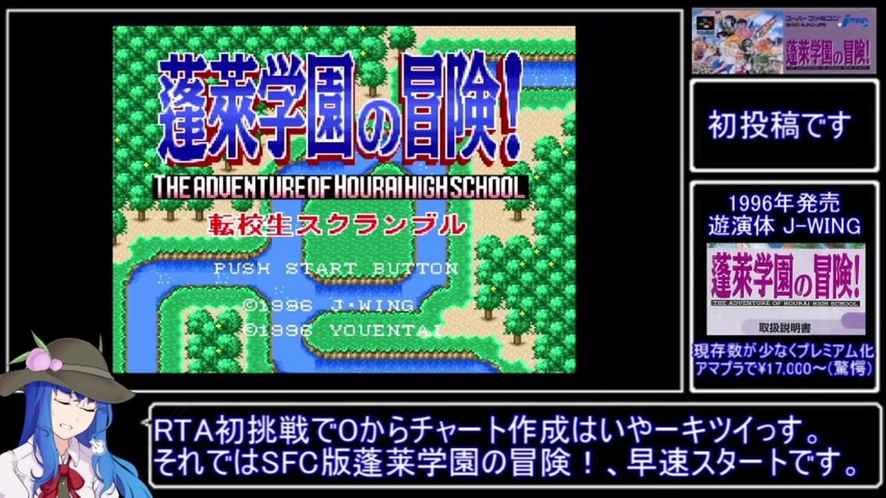 初投稿です<br><br><br><br>嘘です、7年ぶりの動画制作です。RTAに挑戦していきます。<br>第一弾は「蓬莱学園の冒険!転校生スクランブル」です。<br>RTA初挑戦なのに先駆者兄貴皆無作品につき完全創作オリチャーです。<br>スーパーファミコン末期の完全に隠れ切った佳作。<br>蓬莱学園は1990年のPBM原作でTRPGや小説等のメディアミックス作品の先駆け的存在です。<br>今年で30周年らしいので、こういった形で記念参加したいと思います。<br>初回は増量して30分の長めの時間でお送りいたします。<br><br>追記:CAにいちゃもん付けるシーンが図らずも時事ネタになって草<br><br>ゲーム開始~5月前半クリアまで<br>次→<a href="https://www.nicovideo.jp/watch/sm37547186" class="watch">sm37547186</a><br><br>蓬莱学園RTA→<a href="https://www.nicovideo.jp/mylist/69522553" target="_blank" rel="noopener">mylist/69522553</a><br>10年前のelona動画(注:東方&FF11二次創作)→<a href="https://www.nicovideo.jp/mylist/19210992" target="_blank" rel="noopener">mylist/19210992</a>