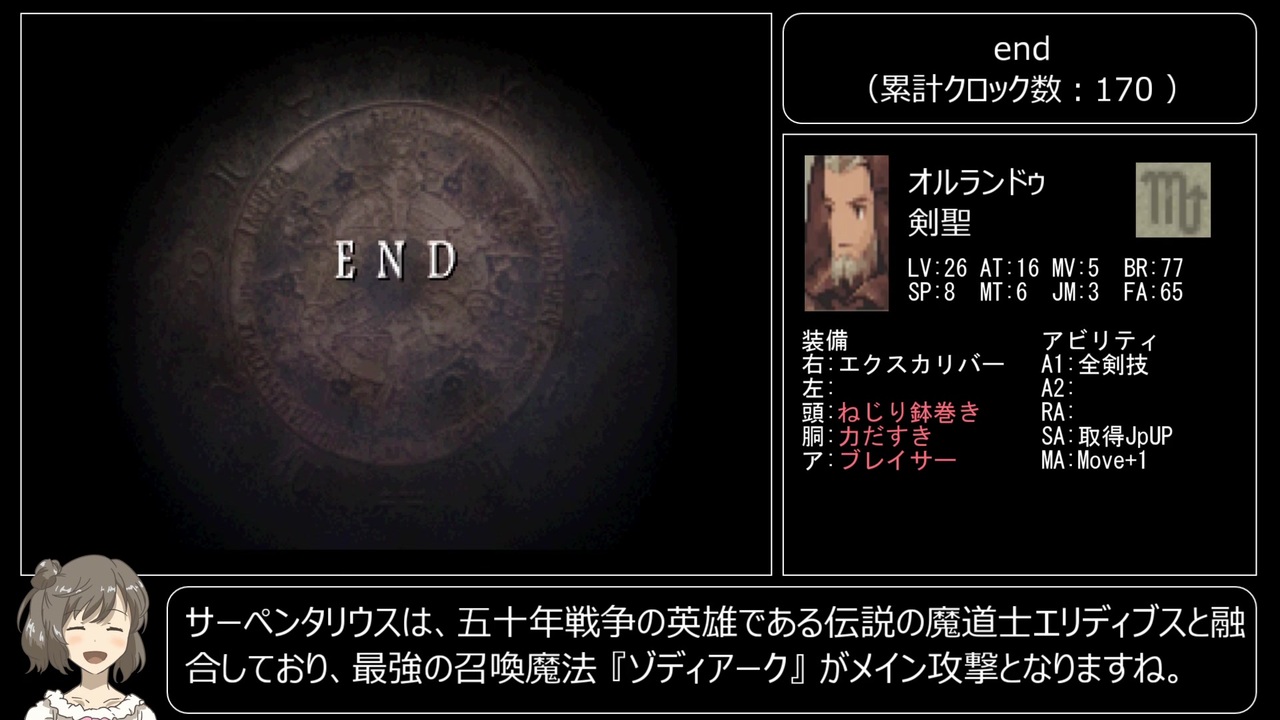 PS版FFTのシナリオを最小クロックでクリアするTAS動画、のサブイベントおまけ動画です。<br>合成音声による解説がありますので、苦手な方はご注意ください。<br>プレイ条件の詳細については、Chapter1-1(<a href="https://www.nicovideo.jp/watch/sm35981364" class="watch">sm35981364</a>)、およびChapter2-3(<a href="https://www.nicovideo.jp/watch/sm36306443" class="watch">sm36306443</a>)の動画末尾で補足しています。<br><br><span style="font-size: 13px;">【プレイ条件】</span><br>1. シナリオ順に戦闘を最小クロックでクリア(勝利条件を満たしたクロックまでカウント)<br>2. 移動日数の最小化(アイテム購入目的の移動は可能)<br>3. メモリーカードからのデータロード禁止<br>4. バグの利用禁止(詳細はChapter2-3の動画末尾で補足)<br>5. Chapter4-4(<a href="https://www.nicovideo.jp/watch/sm36899098" class="watch">sm36899098</a>)クリア時点でのデータを使用(クロックカウントはゼロから数え直し)<br><br><span style="font-size: 13px;">【プレイ環境】</span><br>エミュレータ: BizHawk 2.3.1<br>最終キー入力: 1126365 F(5:16:37)<br>追記回数: 60852+<br><br>【プレイ資料やキームービーファイル等】<br><a href="https://ux.getuploader.com/fftminclock/" target="_blank" rel="noopener nofollow">https://ux.getuploader.com/fftminclock/</a><br>pass: fft-min-clock<br><br><a href="https://www.nicovideo.jp/watch/sm37354089" class="watch">sm37354089</a> < 前<br><span style="color: #000000; font-size: 13px;">クリティカルヒットについて:</span><a href="https://www.nicovideo.jp/watch/sm36058415" class="watch">sm36058415</a><br>マイリスト:<a href="https://www.nicovideo.jp/mylist/66955206" target="_blank" rel="noopener">mylist/66955206</a><br><span style="color: #000000; font-size: 13px;">進捗報告:<a href="https://twitter.com/spherewind1" target="_blank" rel="noopener nofollow">https://twitter.com/spherewind1</a></span>
