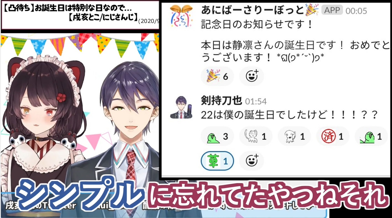 誕生日ボイスさえ出していれば…<br>戌亥とこ <a href="https://www.youtube.com/channel/UCXRlIK3Cw_TJIQC5kSJJQMg?sub_confirmation=1" target="_blank" rel="noopener nofollow">https://www.youtube.com/channel/UCXRlIK3Cw_TJIQC5kSJJQMg?sub_confirmation=1</a><br>剣持刀也 <a href="https://www.youtube.com/channel/UCv1fFr156jc65EMiLbaLImw?sub_confirmation=1" target="_blank" rel="noopener nofollow">https://www.youtube.com/channel/UCv1fFr156jc65EMiLbaLImw?sub_confirmation=1</a><br>鷹宮リオン <a href="https://www.youtube.com/channel/UCV5ZZlLjk5MKGg3L0n0vbzw?sub_confirmation=1" target="_blank" rel="noopener nofollow">https://www.youtube.com/channel/UCV5ZZlLjk5MKGg3L0n0vbzw?sub_confirmation=1</a><br>ドーラ <a href="https://www.youtube.com/channel/UC53UDnhAAYwvNO7j_2Ju1cQ?sub_confirmation=1" target="_blank" rel="noopener nofollow">https://www.youtube.com/channel/UC53UDnhAAYwvNO7j_2Ju1cQ?sub_confirmation=1</a><br><br>・元動画<br>▼【凸待ち】お誕生日は特別な日なので…【戌亥とこ/にじさんじ】(2020/9/9)<br><a href="https://www.youtube.com/watch?v=RWeFaZK1PfE" target="_blank" rel="noopener nofollow">https://www.youtube.com/watch?v=RWeFaZK1PfE</a><br>・該当箇所(2:57:21~)<br><a href="https://www.youtube.com/watch?v=RWeFaZK1PfE&feature=youtu.be&t=10640" target="_blank" rel="noopener nofollow">https://www.youtube.com/watch?v=RWeFaZK1PfE&feature=youtu.be&t=10640</a><br><br>・元ツイート<br><a href="https://twitter.com/rei_Toya_rei/status/1296826709979758595" target="_blank" rel="noopener nofollow">https://twitter.com/rei_Toya_rei/status/1296826709979758595</a><br><a href="https://twitter.com/rei_Toya_rei/status/1298524288564092928" target="_blank" rel="noopener nofollow">https://twitter.com/rei_Toya_rei/status/1298524288564092928</a><br><a href="https://twitter.com/TakamiyaRion/status/1299175476238245888" target="_blank" rel="noopener nofollow">https://twitter.com/TakamiyaRion/status/1299175476238245888</a><br><a href="https://twitter.com/rei_Toya_rei/status/1299192624671121408" target="_blank" rel="noopener nofollow">https://twitter.com/rei_Toya_rei/status/1299192624671121408</a><br><a href="https://twitter.com/___Dola/status/1299224876956282880" target="_blank" rel="noopener nofollow">https://twitter.com/___Dola/status/1299224876956282880</a>