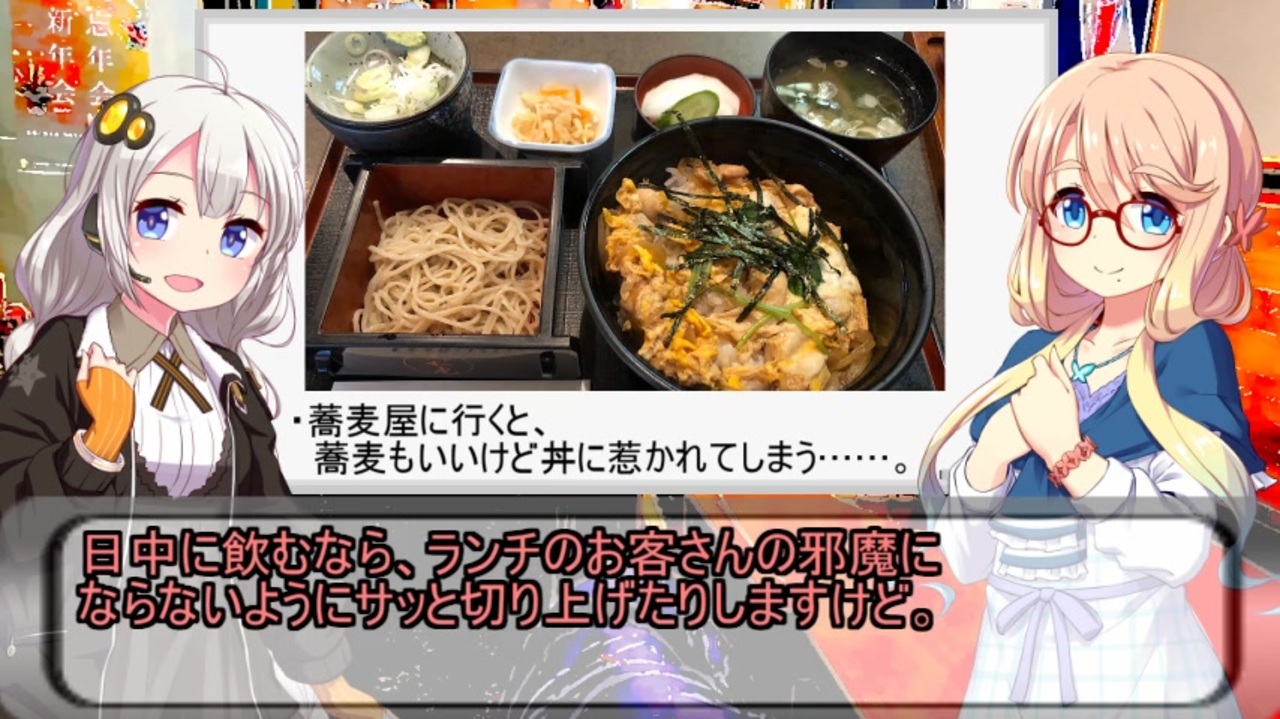 【夜話】……夜にする談話。また、それを記した書物。転じて、肩の凝らない、軽い話。(広辞苑6版より)<br><br>蕎麦屋で飲む蕎麦焼酎の蕎麦湯割りは、寒い時期には最高です。<br><br><a href="https://www.nicovideo.jp/watch/sm37434756" class="watch">sm37434756</a><前回 次回><br>よろしければこちらもどうぞ。<br>【一人居酒屋のススメ】シリーズ <a href="https://www.nicovideo.jp/series/11537" target="_blank" rel="noopener">series/11537</a><br />脚本担当新作「ギャルとおっさん」<br>昭和世代のおっさんと、Z世代のギャルの凸凹コンビが奮闘する痛快お仕事バディものです。飛鳥新社様より発売中!<br><a href="https://books.rakuten.co.jp/rb/17916572/?variantId=17916572" target="_blank" rel="noopener nofollow">https://books.rakuten.co.jp/rb/17916572/?variantId=17916572</a><br><br>ストーリー・脚本担当漫画『世話焼きキナコの××管理』ニコニコ漫画にて掲載中!<br><a href="https://seiga.nicovideo.jp/watch/mg723837?track=ct_cover" target="_blank" rel="noopener nofollow">https://seiga.nicovideo.jp/watch/mg723837?track=ct_cover</a><br><br><br>公開中(旧LINEノベル/LINE文庫作品)<br>居酒屋がーる(1)(2)-カクヨム <a href="https://kakuyomu.jp/works/1177354054921354444" target="_blank" rel="noopener nofollow">https://kakuyomu.jp/works/1177354054921354444</a><br><br>連動小説企画はこちら<br><span style="color: #000000; font-size: 14px;">居酒屋ほろのみ実況録 - カクヨム </span><span style="color: #006699; font-size: 14px;"><a href="https://kakuyomu.jp/works/1177354054892820063" target="_blank" rel="noopener nofollow">https://kakuyomu.jp/works/1177354054892820063</a></span><br><br>YouTube再編集版<a href="https://www.youtube.com/watch?v=84qr_9kXJLw" target="_blank" rel="noopener nofollow">https://www.youtube.com/watch?v=84qr_9kXJLw</a><br><br><span style="color: #000000; font-size: 13px;">別シリーズ【あかりちゃんの居酒屋入門講座マイリスト】</span><span style="color: #006699; font-size: 14px;"><a href="https://www.nicovideo.jp/mylist/66136747" target="_blank" rel="noopener">mylist/66136747</a></span><br><span style="color: #000000; font-size: 13px;">TOGA様より素敵な支援絵を頂きました! ありがとうございます! ></span><span style="color: #006699; font-size: 14px;"><a href="https://seiga.nicovideo.jp/seiga/im9684297" target="_blank" rel="noopener">im9684297</a></span><br><br>ofuse開設しました。<a href="https://ofuse.me/63e47925" target="_blank" rel="noopener nofollow">https://ofuse.me/63e47925</a><br>