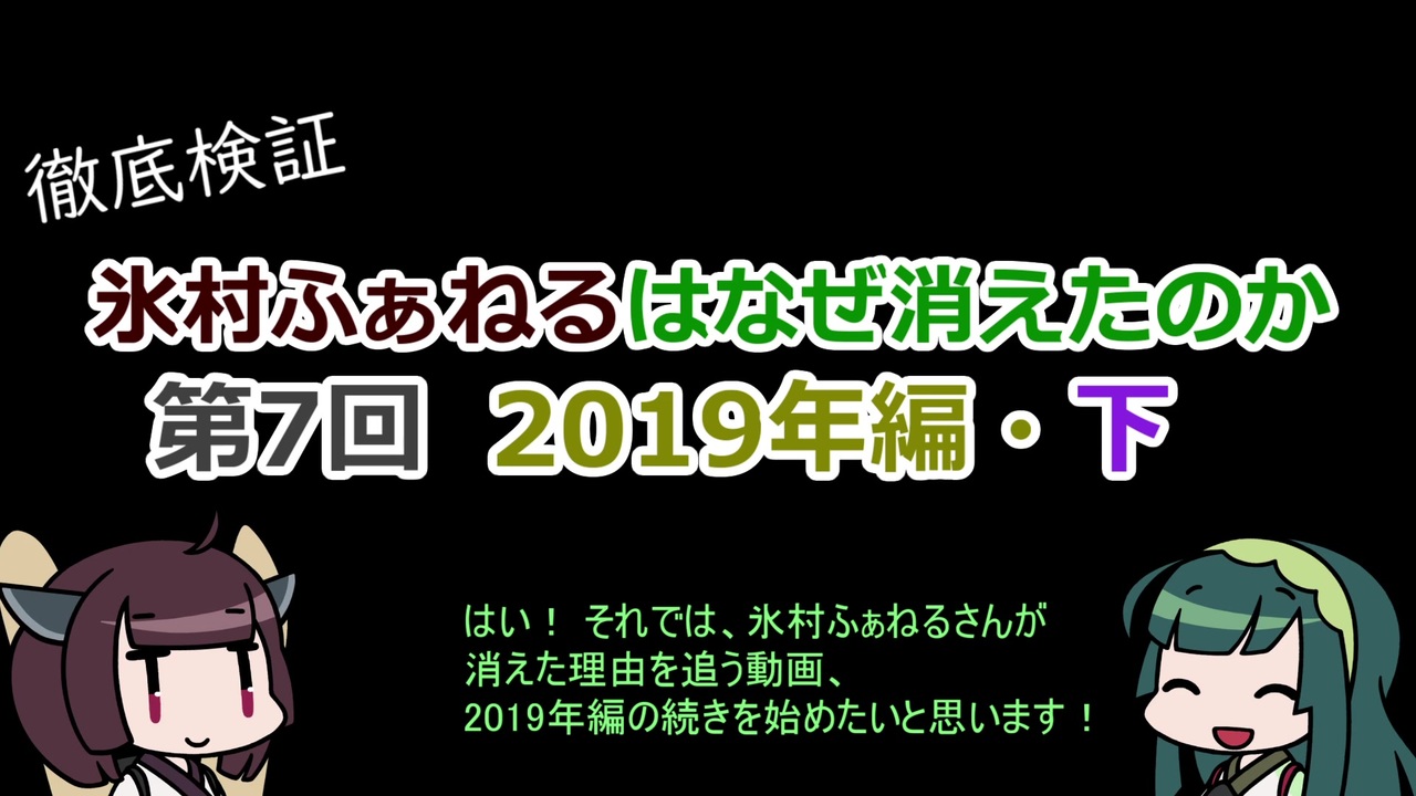 ふぁねる最後の日<br><br>第1回2017年編:<a href="https://www.nicovideo.jp/watch/sm37208522" class="watch">sm37208522</a><br>第2回2018年編:<a href="https://www.nicovideo.jp/watch/sm37208688" class="watch">sm37208688</a><br>第3回2019年編・上:<a href="https://www.nicovideo.jp/watch/sm37246166" class="watch">sm37246166</a><br><span style="color: #000000; font-size: 14px;">第4回2019年編・中1:</span><a href="https://www.nicovideo.jp/watch/sm37283513" class="watch">sm37283513</a><br><span style="color: #000000; font-size: 14px;">第5回2019年編・中2:</span><a href="https://www.nicovideo.jp/watch/sm37320076" class="watch">sm37320076</a><br><span style="color: #000000; font-size: 14px;">第6回2019年編・中3:</span><a href="https://www.nicovideo.jp/watch/sm37399299" class="watch">sm37399299</a><br>第7回2019年編・下:ココ<br>第8回2020年編・上:<a href="https://www.nicovideo.jp/watch/sm37925234" class="watch">sm37925234</a>