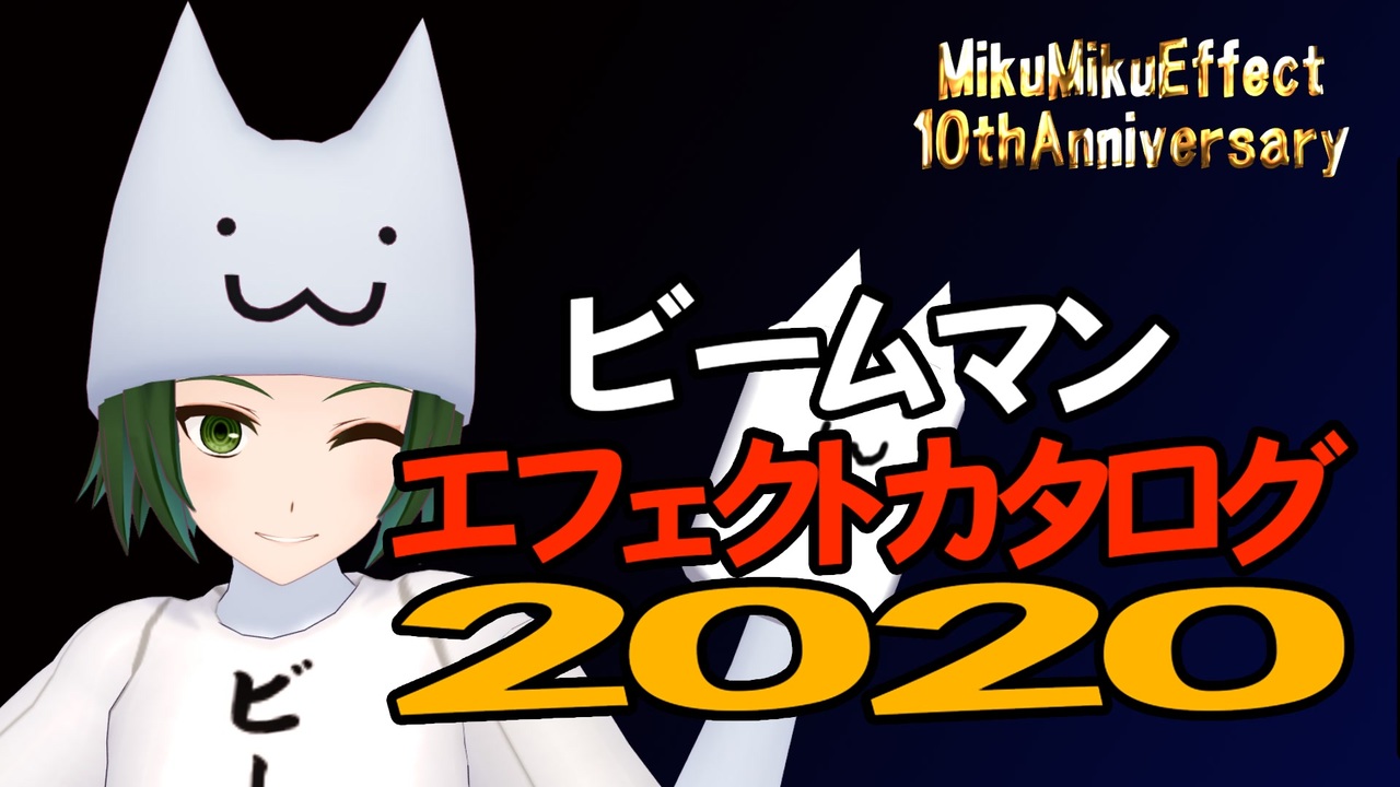 MME10周年(+1日)!つまりビームマンも10周年!(厳密には10月だけどまあよかろ<br>おめでたいので概ね全てのエフェクトをまとめたカタログを作ったよ!<br><br>あ、マンさんのエフェクトを沢山ツリー登録するのが面倒な時でも、この動画を登録してくれると嬉しいよ!<br><br>エフェクトジャンル別ショートカット<br>シェーダ:<a href="#" class="seekTime" data-seekTime="00:05" onclick="seekNicoPlayer('#00:05'); return false;">#00:05</a> パーティクル:<a href="#" class="seekTime" data-seekTime="00:43" onclick="seekNicoPlayer('#00:43'); return false;">#00:43</a> ポスト:<a href="#" class="seekTime" data-seekTime="01:36" onclick="seekNicoPlayer('#01:36'); return false;">#01:36</a> オブジェクト:<a href="#" class="seekTime" data-seekTime="02:13" onclick="seekNicoPlayer('#02:13'); return false;">#02:13</a> 特殊:<a href="#" class="seekTime" data-seekTime="03:42" onclick="seekNicoPlayer('#03:42'); return false;">#03:42</a><br><br>そしてキノコルさんがビームマン第四形態を作ってくれたから配布するよ!!<br><br>バ美ームマン:<a href="https://ux.getuploader.com/BeamMan4/download/50" target="_blank" rel="noopener nofollow">https://ux.getuploader.com/BeamMan4/download/50</a><br>エフェクトのDLはこちら: <span style="color: #006699;"><a href="https://www43.atwiki.jp/beamman/" target="_blank" rel="noopener nofollow">https://www43.atwiki.jp/beamman/</a></span><br><br />エフェクト作るよ!:<a href="https://www.nicovideo.jp/mylist/9973286" target="_blank" rel="noopener">mylist/9973286</a><br>MMEちょっと良い話:<a href="https://www.nicovideo.jp/mylist/28429070" target="_blank" rel="noopener">mylist/28429070</a><br>MMD動画作るよ!:<a href="https://www.nicovideo.jp/mylist/22596285" target="_blank" rel="noopener">mylist/22596285</a> <br>何かそれ以外のも作るよ!:<a href="https://www.nicovideo.jp/mylist/21031430" target="_blank" rel="noopener">mylist/21031430</a>