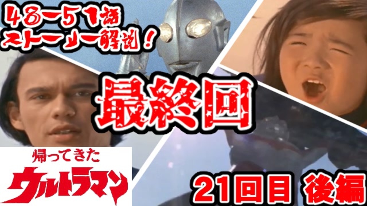<span style="color: #000000; font-size: 14px;">視聴・コメント・マイリス・宣伝して下さっている方々、いつもありがとうございます。</span><br>21回目は帰ってきたウルトラマンについて解説<br>後編では48話~51話の最終回までのストーリーについて紹介していきます<br><br><span style="font-size: 14px;">YouTube版はこちら</span><br><a href="https://youtu.be/jXPpanh5ajU" target="_blank" rel="noopener nofollow">https://youtu.be/jXPpanh5ajU</a><br><br><span style="font-size: 14px;">いろいろと特撮関連話したい方はコミュへ ⇒ </span><span style="color: #006699; font-size: 14px;">co76058</span><br><span style="color: #000000; font-size: 14px;">あとツイッターもよろしく ⇒ </span><span style="color: #006699; font-size: 14px;"><strong><a href="https://twitter.com/zy36nssnc" target="_blank" rel="noopener nofollow">https://twitter.com/zy36nssnc</a></strong></span><br><br>次回 → <a href="https://www.nicovideo.jp/watch/sm37582307" class="watch">sm37582307</a><br>前回 → <a href="https://www.nicovideo.jp/watch/sm37548820" class="watch">sm37548820</a><br><span style="color: #000000; font-size: 13px;">まとめ → <a href="https://www.nicovideo.jp/mylist/67198641" target="_blank" rel="noopener">mylist/67198641</a><br>SDガンダム解説動画まとめ</span><span style="color: #000000; font-size: 14px;"> ⇒ </span><span style="color: #006699; font-size: 14px;"><a href="https://www.nicovideo.jp/mylist/53613483" target="_blank" rel="noopener">mylist/53613483</a></span>