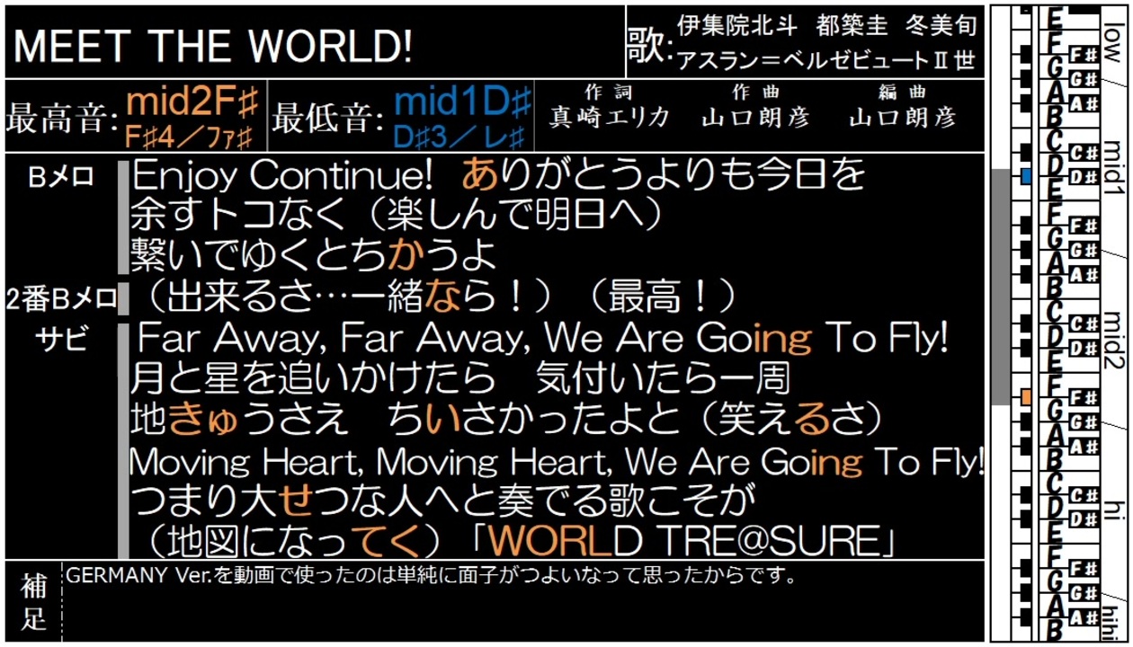 お久しぶりです。<br>WORLD TRE@SUREシリーズ完結おめでとうございます!(とても今更)<br>アイドルマスター15周年おめでとうございます!(今更)<br>…このシリーズの最後の投稿から2年近く経ってるってマジ?<br>そしてこの2年の間でアイマス曲ってのはどれくらい増えたんだろうね(遠い目)<br><br>◆アイドルマスターの楽曲の最高音と最低音を独自に調べて動画にまとめました。<br>◆今回は「WORLD TRE@SURE」シリーズ収録曲(14曲)を調べました。<br>◆基本的に台詞やコーラス、合いの手は調査対象外ですのでご了承ください。<br><br>その他の音域調査動画→<a href="https://www.nicovideo.jp/mylist/25716660" target="_blank" rel="noopener">mylist/25716660</a><br>blog形式でまとめたもの→<a href="http://n0at0n.blog.fc2.com/" target="_blank" rel="noopener nofollow">http://n0at0n.blog.fc2.com/</a><br>動画内の画像の生成ツール(自作)も公開中。Excelです。⇒<a href="https://www.axfc.net/u/3830985" target="_blank" rel="noopener nofollow">https://www.axfc.net/u/3830985</a><br><br><宣伝・協力依頼><br>音域調査に協力していただける方、引き続き募集中です。<br><a href="http://n0at0n.blog.fc2.com/blog-entry-200.html" target="_blank" rel="noopener nofollow">http://n0at0n.blog.fc2.com/blog-entry-200.html</a><br>(ブログ投稿用のツールも新調しました。Googleスプレッドシートにて)<br>また最近めっちゃ増えてるアイマス曲の情報も別で提供してもらえると助かります。<br><br>ブロマガ書いたのに乗せるの忘れてましたね…<br><a href="https://ch.nicovideo.jp/n0at0n/blomaga/ar1849169" target="_blank" rel="noopener nofollow">https://ch.nicovideo.jp/n0at0n/blomaga/ar1849169</a><br><br> P さん、^^) _旦~~ さん、ひとみ さん、ちえり さん、もか さん、泣き虫 さん、火炎土器 さん、ぬん さん、結月 さん、わくわく さん、ふぁぼ原 さん、渋皮 さん、100マイル さん、ワールドツーリスト さん、ぬん さん、うつー人 さん、広告ありがとうございます。