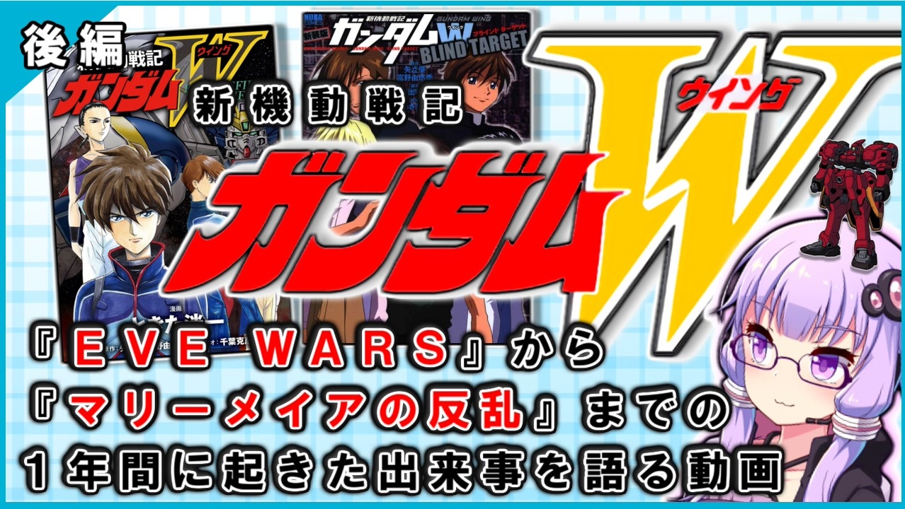 沢山のコメントやマイリス、フォロー、広告ありがとうございます。<br><br>-----注意事項------<br>・作品のネタばれが多分に含まれる場合があります。<br>・誤字脱字、間違いなどある場合があります。<br>・調べて動画を作成していますが、この動画の情報が必ず正しいというわけではありません。<br> ですので、ガンダム好きが早口で何か言っているくらいの認識での視聴をお勧めします。<br><br>次:だいたい12分でわかるFrozen Teardrop ⇒<a href="https://www.nicovideo.jp/watch/sm37620163" class="watch">sm37620163</a><br>前:EWまでの空白の一年間を語る動画 【前編】 ⇒<a href="https://www.nicovideo.jp/watch/sm37548608" class="watch">sm37548608</a><br><br>【新機動戦記ガンダムW】<span style="color: #4d5156; font-size: 14px;">Endless Waltz</span><span style="color: #000000; font-size: 14px;"> 敗者たちの栄光の解説 ⇒</span><a href="https://www.nicovideo.jp/mylist/68922905" target="_blank" rel="noopener">mylist/68922905</a><br><br>※以前の動画<br>【ガンダム00外伝MS解説】⇒<span style="color: #006699; font-size: 14px;"><a href="https://www.nicovideo.jp/mylist/66597479" target="_blank" rel="noopener">mylist/66597479</a></span>