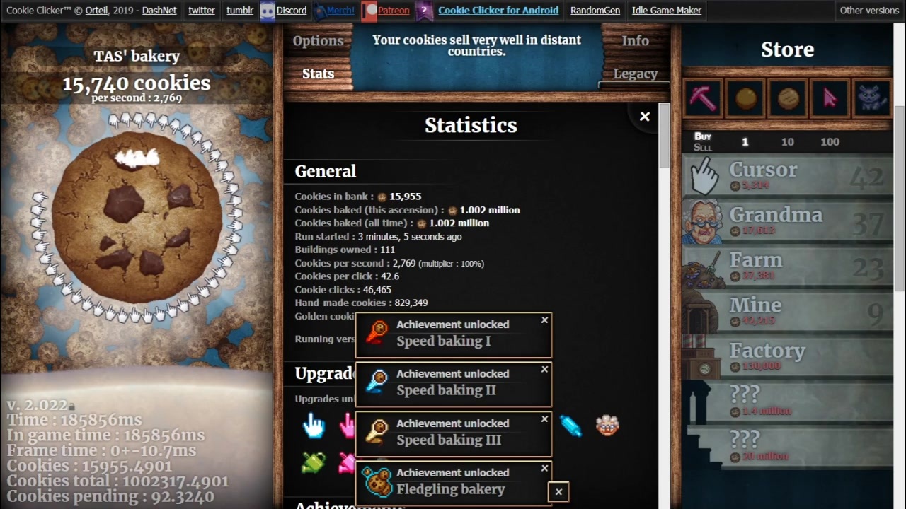 どんどん古典的なTASの作り方から離れていくTAS。<br><br>ニコニコ動画で見つけたちぃがぅさんの記録(<a href="https://www.nicovideo.jp/watch/sm22515258" class="watch">sm22515258</a>)より(バージョンやレギュレーションは違いますが)約45秒、YouTubeで見つけたKragnirさんの記録(<a href="https://youtu.be/IC-AvdTqRiI" target="_blank" rel="noopener nofollow">https://youtu.be/IC-AvdTqRiI</a> )より(これもバージョンは違いますが)より約64秒の更新です。v. 2.x系は100万クッキーにおいてv. 1.0466より早いです。<br><br>ちぃがぅさんのTASのようにクリスマスシーズンを許容したものはまだ作っていませんが、3分切ってもおかしくはないと思います。<br><br>ちなみに、Neverclick系や実績40個などでGCを使う場合、最速には1/9007199254740991×GCの効果の出る確率の乱数を引く必要がありますが、カスタムのRNGがしっかりしているのと、ランダムに名前を生成することで好きに乱数を回すことができるので問題ありません。<br><br>スプレッドシート: <a href="https://docs.google.com/spreadsheets/d/1sbn9cChJo1NA1_QrhGFMA_Zj5vtwNZApRs4pv77k3Xg" target="_blank" rel="noopener nofollow">https://docs.google.com/spreadsheets/d/1sbn9cChJo1NA1_QrhGFMA_Zj5vtwNZApRs4pv77k3Xg</a><br>TASを実行するやつ: <a href="https://github.com/Naruyoko/CCTASPlayer" target="_blank" rel="noopener nofollow">https://github.com/Naruyoko/CCTASPlayer</a>