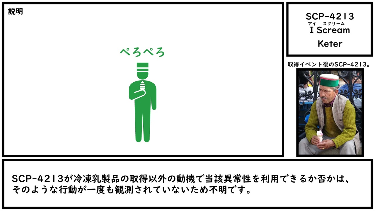 せめてさあ、もちっと美味そうに食べてくんない? やだ? あ、そう……。<br><br>本家記事 <a href="http://scp-wiki.wikidot.com/scp-4213" target="_blank" rel="noopener nofollow">http://scp-wiki.wikidot.com/scp-4213</a><br>翻訳記事 <a href="http://scp-jp.wikidot.com/scp-4213" target="_blank" rel="noopener nofollow">http://scp-jp.wikidot.com/scp-4213</a><br><span style="color: rgba(0, 0, 0, 0.87); font-size: 15px;">作者 </span>Doctor Cimmerian、Yossipossi ※共同制作<br><span style="color: rgba(0, 0, 0, 0.87); font-size: 15px;">SCP財団 <a href="http://scp-jp.wikidot.com" target="_blank" rel="noopener nofollow">http://scp-jp.wikidot.com</a></span><br><span style="color: #000000; font-size: 14px;">過去の動画はこちら </span><span style="color: #006699; font-size: 14px;"><a href="https://www.nicovideo.jp/mylist/67620202" target="_blank" rel="noopener">mylist/67620202</a></span><br><span style="color: rgba(0, 0, 0, 0.87); font-size: 15px;">CC-BY-SA 3.0</span>