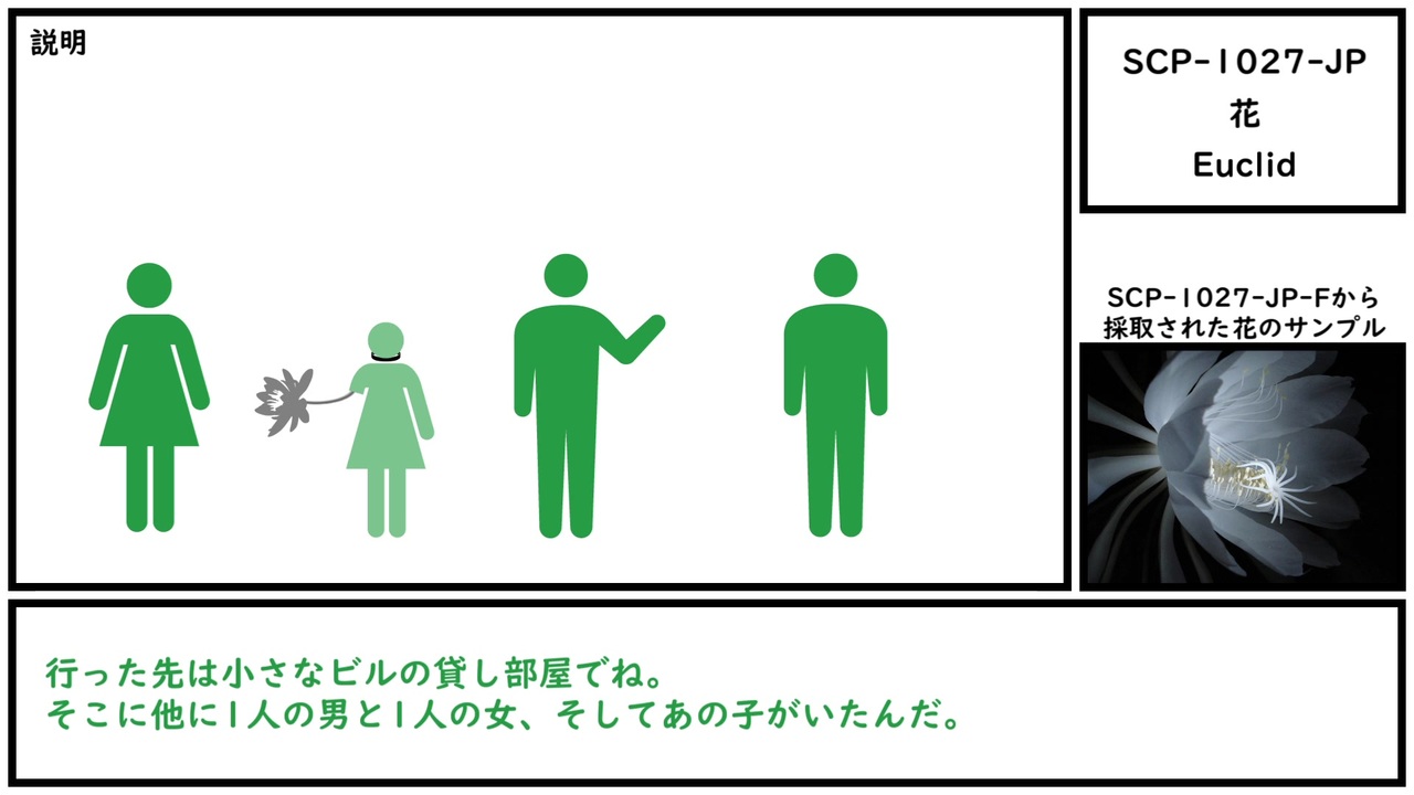 根があるから花が咲くのか、「花が咲いているから根もある」のか。<br><br><span style="color: rgba(0, 0, 0, 0.87); font-size: 15px;">本家記事 </span><a href="http://scp-jp.wikidot.com/scp-1027-jp" target="_blank" rel="noopener nofollow">http://scp-jp.wikidot.com/scp-1027-jp</a><br><span style="color: rgba(0, 0, 0, 0.87); font-size: 15px;">作者 </span>Porsche466<br><span style="color: rgba(0, 0, 0, 0.87); font-size: 15px;">SCP財団 <a href="http://scp-jp.wikidot.com" target="_blank" rel="noopener nofollow">http://scp-jp.wikidot.com</a></span><br><span style="color: #000000; font-size: 14px;">過去の動画はこちら </span><span style="color: #006699; font-size: 14px;"><a href="https://www.nicovideo.jp/mylist/67620202" target="_blank" rel="noopener">mylist/67620202</a></span><br><span style="color: rgba(0, 0, 0, 0.87); font-size: 15px;">CC-BY-SA 3.0</span>