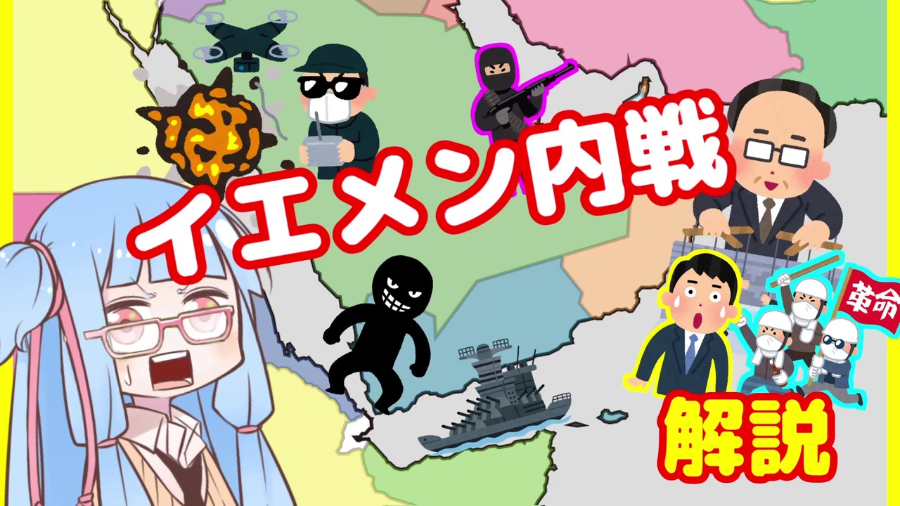 2本同時作成はさすがに疲れた・・・<br>シリア内戦に比べて影が薄いイエメン内戦。<br>こっちの方が日本にとって重要なんだけどなあ。<br><br>色々書いたけど、結局サウジアラビアがアレだから正確な狙いはわからないんですよね。<br />※この動画ではA.I.VOICEを使っていますが、普及具合を鑑みてタグにはVOICEROID解説を併記させていただいております。<br><br>世界情勢検索ボット作成中(note):<a href="https://note.com/todo_1582/n/n3b76a6aafd0d" target="_blank" rel="noopener nofollow">https://note.com/todo_1582/n/n3b76a6aafd0d</a><br>ニコニコチャンネル:<a href="https://ch.nicovideo.jp/to-do" target="_blank" rel="noopener nofollow">https://ch.nicovideo.jp/to-do</a><br>現代史解説 <a href="https://www.nicovideo.jp/series/166058" target="_blank" rel="noopener">series/166058</a><br>世界情勢振り返り <a href="https://www.nicovideo.jp/series/352199" target="_blank" rel="noopener">series/352199</a><br>ムスリみの違い解説 <a href="https://www.nicovideo.jp/series/352200" target="_blank" rel="noopener">series/352200</a><br>マイリスト <a href="https://www.nicovideo.jp/mylist/69599837" target="_blank" rel="noopener">mylist/69599837</a><br>Youtube:<a href="https://youtube.com/playlist?list=PL6pjlejdhtK6JxdZZp_3ZqAGmDghvdfu0" target="_blank" rel="noopener nofollow">https://youtube.com/playlist?list=PL6pjlejdhtK6JxdZZp_3ZqAGmDghvdfu0</a>