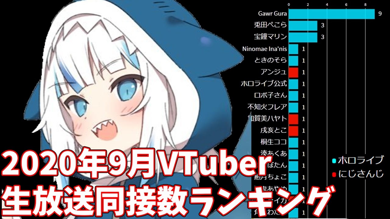 ※9月22日のGawr Guraさんの最大同接数が36634人となっていますが、48449人の誤りです。もうしわけありません<br><br>2020年9月各日のVTuberの同時視聴者数トップのライブを調べて、動くグラフにしました(同時接続数、同接数)<br><br>出典:VNUMA、各VTuber公式YouTubeチャンネル、Wikipedia<br><a href="https://hiyoko.sonoj.net/" target="_blank" rel="noopener nofollow">https://hiyoko.sonoj.net/</a><br><br>BGM:FIRST STEP TOWARDS WARS/イースI&IIクロニクルズ <br>オリジナルサウンドトラック/Copyright© Nihon Falcom Corporation<br>ファルコム音楽フリー宣言に基づき、日本ファルコムの音楽を利用しています<br><a href="https://www.falcom.co.jp/music-use" target="_blank" rel="noopener nofollow">https://www.falcom.co.jp/music-use</a><br><br>作者Twitter:<a href="https://twitter.com/michsuzu" target="_blank" rel="noopener nofollow">https://twitter.com/michsuzu</a>