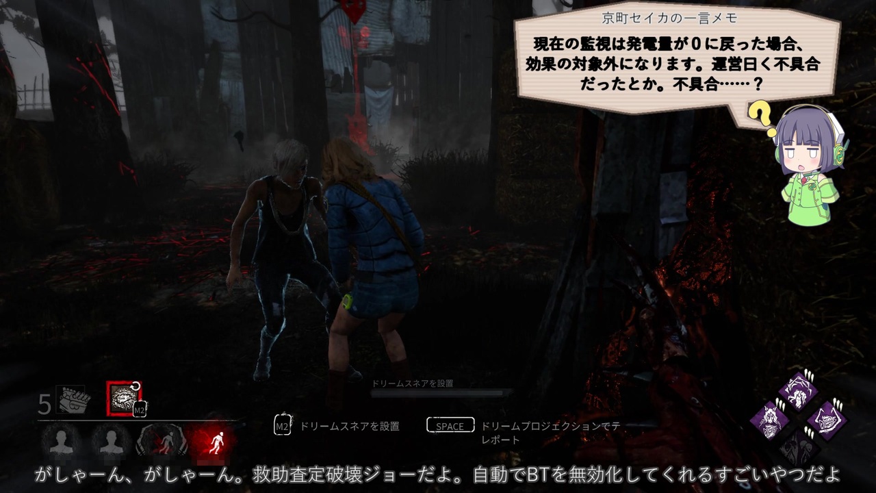 チェイス以外が全自動<br><br><a href="https://www.nicovideo.jp/watch/sm37573669" class="watch">sm37573669</a>←前回 リスト <a href="https://www.nicovideo.jp/mylist/62705262" target="_blank" rel="noopener">mylist/62705262</a> 次回→<a href="https://www.nicovideo.jp/watch/sm37909121" class="watch">sm37909121</a><br><br>不死ルイン強すぎる問題<br>冗談抜きで過去最強のキラーパークなのかもしれません<br><br>以下パーク説明という名のコピペ<br><br>・呪術:不死<br>儀式中に漂う邪悪な力を維持する呪い。<br>呪術:不死の発動中に異なる呪いのトーテムが浄化されると、無力なトーテムが残っている場合、その呪術は無力なトーテムに移動する。<br>呪術が移動すると、その呪術パークに累積したトークンは消滅する。<br>いずれかのトーテムの2m以内にいる生存者のオーラが4/5/6秒間視える<br><br>・呪術:破滅<br>トーテムの1つに呪いが付与される<br>生存者が発電機の修理を中断すると、自動的に後退状態となる。<br>この後退状態では通常後退速度の100・150・200%で後退する。<br>ただし、この効果は付与された呪いのトーテムがある間持続する<br><br>・監視<br>進行度が後退している状態のすべての発電機のオーラを白く表示し、それが生存者に食い止められると<br>8秒・12秒・16秒黄色く表示する。発電機の修理音の聞こえる範囲が8m広くなる。<br>(進行度がゼロになった場合は白から通常の赤へ戻る。黄色の時間が終わった場合も赤に戻る。音による通知は無い。)<br><br>・戦慄<br>生存者を担いだ後、生存者によって修理中でない発電機すべてがエンティティにより<br>ブロックされ、次の16秒間修理不能になる。<br>ブロックされている発電機は白いオーラでハイライトされる。<br>このパークは100・80・60秒ごとに発動可能。<br>