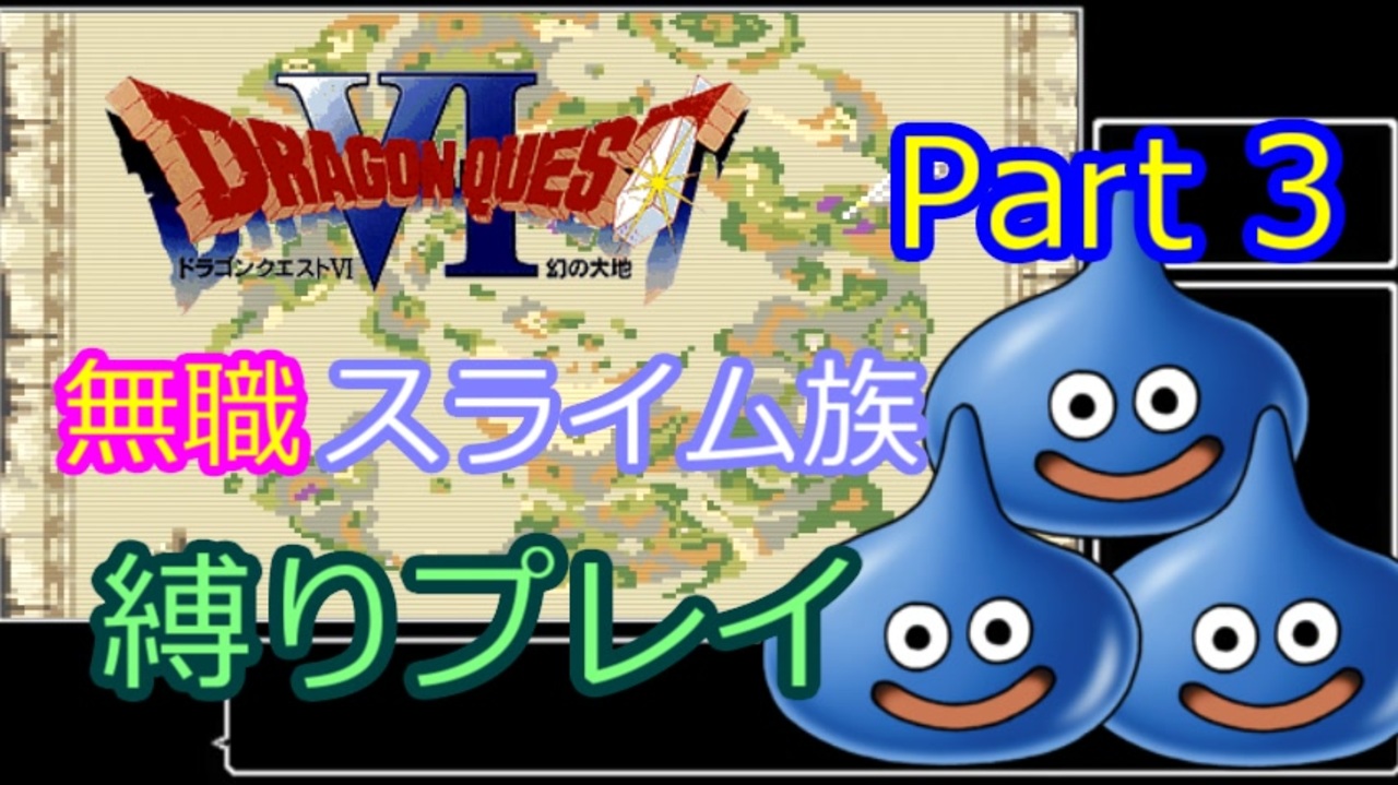 新たなる地へ<br><br>縛り内容<br>・仲間モンスターを仲間にできるムドー討伐後からスタート<br>・仲間にできるモンスターはスライム族のみ(スライム、ホイミスライム、スライムナイト、キングスライム、はぐれメタル、ルーキー)同属の仲間数には制限なし<br>・転職は無し(馬車から外せない主人公、バーバラはあり)<br>・スライム族のみ戦闘可能(ただしモンスターを仲間にする際およびイベント戦闘は主人公を出して防御)<br>・道中の呪文特技もスライム族のみ(ただし遊び人の口笛のみあり:効率化のため)<br>・そうびコマンドによるデバフ(ルカナン等)の解除バグ禁止<br><br><a href="https://www.nicovideo.jp/watch/sm37632526" class="watch">sm37632526</a>←前 次→<a href="https://www.nicovideo.jp/watch/sm37740628" class="watch">sm37740628</a><br><br>DQ6マイリスト→<a href="https://www.nicovideo.jp/mylist/69659897" target="_blank" rel="noopener">mylist/69659897</a><br>生放送アーカイブマイリスト→<a href="https://www.nicovideo.jp/mylist/67508130" target="_blank" rel="noopener">mylist/67508130</a><br>スマブラ動画マイリスト→<a href="https://www.nicovideo.jp/mylist/58963838" target="_blank" rel="noopener">mylist/58963838</a><br>ニコ生:co2262942<br>ツイッター:<a href="https://twitter.com/nekopanchi8940" target="_blank" rel="noopener nofollow">https://twitter.com/nekopanchi8940</a>