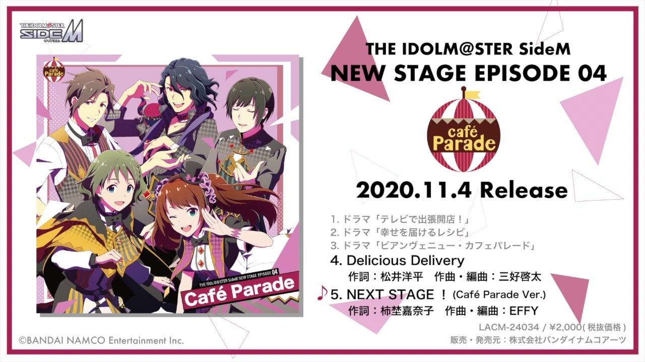 【公式】<br><a href="https://www.youtube.com/watch?v=ekV4G66wGYs&ab_channel=LantisChannel" target="_blank" rel="noopener nofollow">https://www.youtube.com/watch?v=ekV4G66wGYs&ab_channel=LantisChannel</a><br><br>THE IDOLM@STER SideM NEW STAGE EPISODE:04 Café Parade<br>Café Parade [神谷幸広(CV.狩野 翔), 東雲荘一郎(CV.天﨑滉平), アスラン=ベルゼビュートⅡ世(CV.古川 慎), 卯月巻緒(CV.児玉卓也), 水嶋 咲(CV.小林大紀)]<br><br>2020年11月4日発売<br>LACM-24034 / ¥2,000(税抜価格)<br>販売・発売元:株式会社バンダイナムコアーツ<br><br>©BANDAI NAMCO Entertainment Inc.<br><br><br>INDEX<br>1. ドラマ「テレビで出張開店!」<br>2. ドラマ「幸せを届けるレシピ」<br>3. ドラマ「ビアンヴェニュー・カフェパレード」<br>4. Delicious Delivery<br> 作詞:松井洋平 作曲・編曲:三好啓太<br>5.NEXT STAGE!(Café Parade Ver.)<br> 作詞:柿埜 嘉奈子 作曲・編曲:EFFY