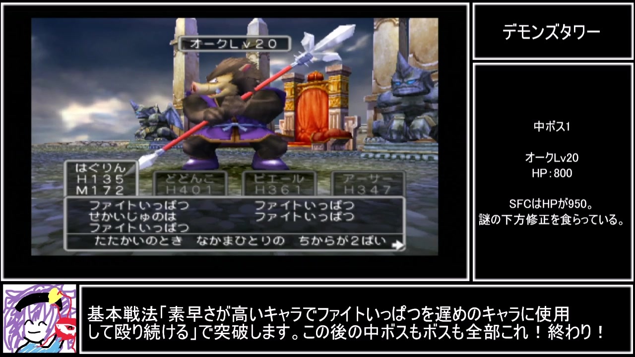 石↑化↓ってのはしたことある?<br><br><strong>※編集によりゲーム内のBGMとSEが無い場合があります。ご了承下さい。</strong><br><br><span style="color: rgba(0, 0, 0, 0.87); font-size: 15px;">【今回の内容】</span><br>デモンズタワー~世界各地のアイテム回収+次Partからの流れ説明<br><br><strong>本動画のプレイ(縛り)内容<br>1.モンスターボックスコンプリート<br>2.アイテムコンプリート(全種類のアイテムを所持する) ※一部不可能なアイテムは妥協<br>3.仲間モンスター全3匹勧誘<br>4.失踪しない</strong><br><br><a href="https://www.nicovideo.jp/watch/sm37660087" class="watch">sm37660087</a>←前 次→<a href="https://www.nicovideo.jp/watch/sm37718518" class="watch">sm37718518</a><br><br>本シリーズまとめ <a href="https://www.nicovideo.jp/mylist/70287027" target="_blank" rel="noopener">mylist/70287027</a><br><br>※一部汚い音声があるので苦手な人はブラバしましょう。<br><br><span style="color: #000000; font-size: 14px;">Youtube版→</span><a href="https://youtu.be/aVP-L6D6aB4" target="_blank" rel="noopener nofollow">https://youtu.be/aVP-L6D6aB4</a><br><br>©2004 ARMOR PROJECT/BIRD STUDIO/ARTEPIAZZA/SQUARE ENIX All Rights Reserved.<br>©KOICHI SUGIYAMA