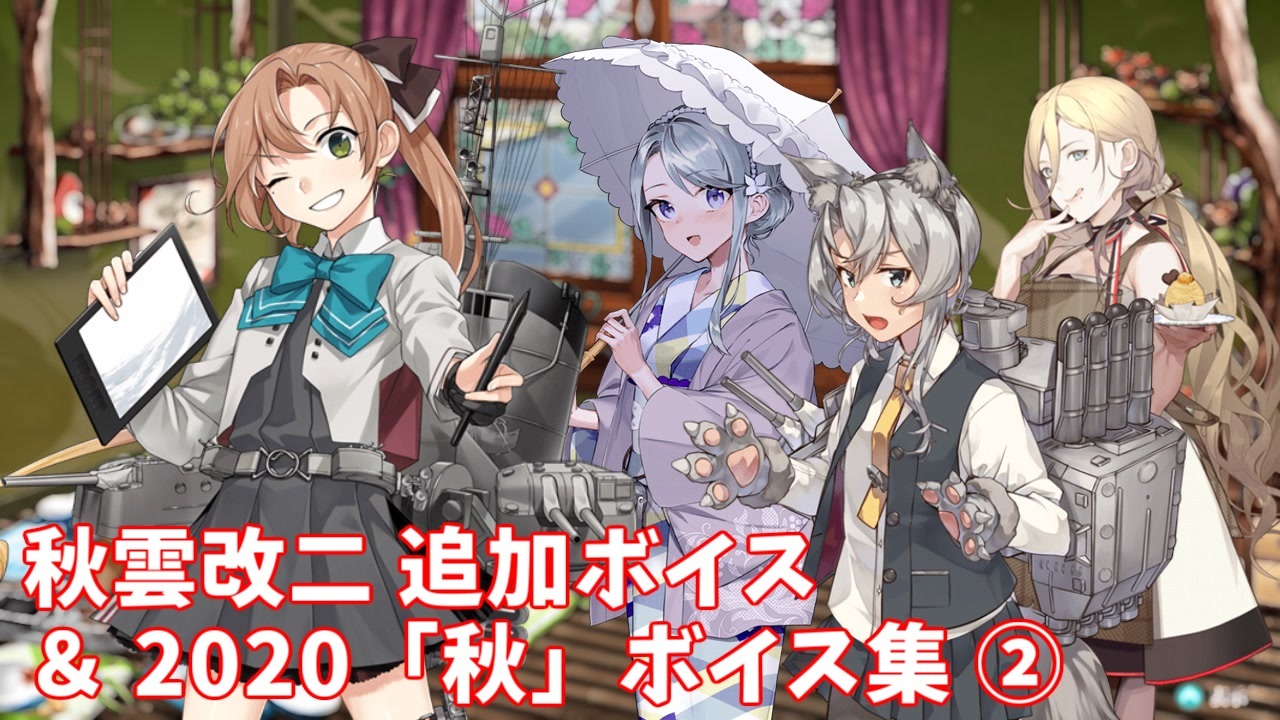 秋雲改二の追加ボイスと、17隻の新規「秋」ボイス集です。<br>9/17のアップデートで追加された伊47と狭霧の期間限定グラフィックも収録しています。<br>※利根のボイスは以前と同じだったため収録していません。また、Grecaleのボイスは後半部分が新規に追加されています。<br>※村雨の更新されたF作業modeは収録し忘れたため、次回の動画で収録しています。<br><br><a href="#" class="seekTime" data-seekTime="00:04" onclick="seekNicoPlayer('#00:04'); return false;">#00:04</a> 秋雲改二 追加ボイス<br><a href="#" class="seekTime" data-seekTime="01:03" onclick="seekNicoPlayer('#01:03'); return false;">#01:03</a> 限定ボイス 図鑑No.順<br>(川内 加古 初春 子日 初霜 白露 村雨 夕立改二 野分 浦波 <br>CommandantTeste Richelieu GambierBay Johnston Grecale 薄雲 迅鯨改)<br><br>新規絵(秋雲改二、村雨改二、野分、狭霧、Richelieu、伊47)<br><br>前|加賀改二 追加ボイス & 2020「秋」ボイス集① (8/27アップデート) <a href="https://www.nicovideo.jp/watch/sm37436067" class="watch">sm37436067</a><br><strong>次|丹陽 & 雪風改二 追加ボイス集 (11/13アップデート) </strong><a href="https://www.nicovideo.jp/watch/sm37823987" class="watch">sm37823987</a><br><br>艦これ追加ボイス集 マイリスト(<a href="https://www.nicovideo.jp/mylist/40513442" target="_blank" rel="noopener">mylist/40513442</a>)<br>シリーズ (<a href="https://www.nicovideo.jp/series/34200" target="_blank" rel="noopener">series/34200</a>)<br>