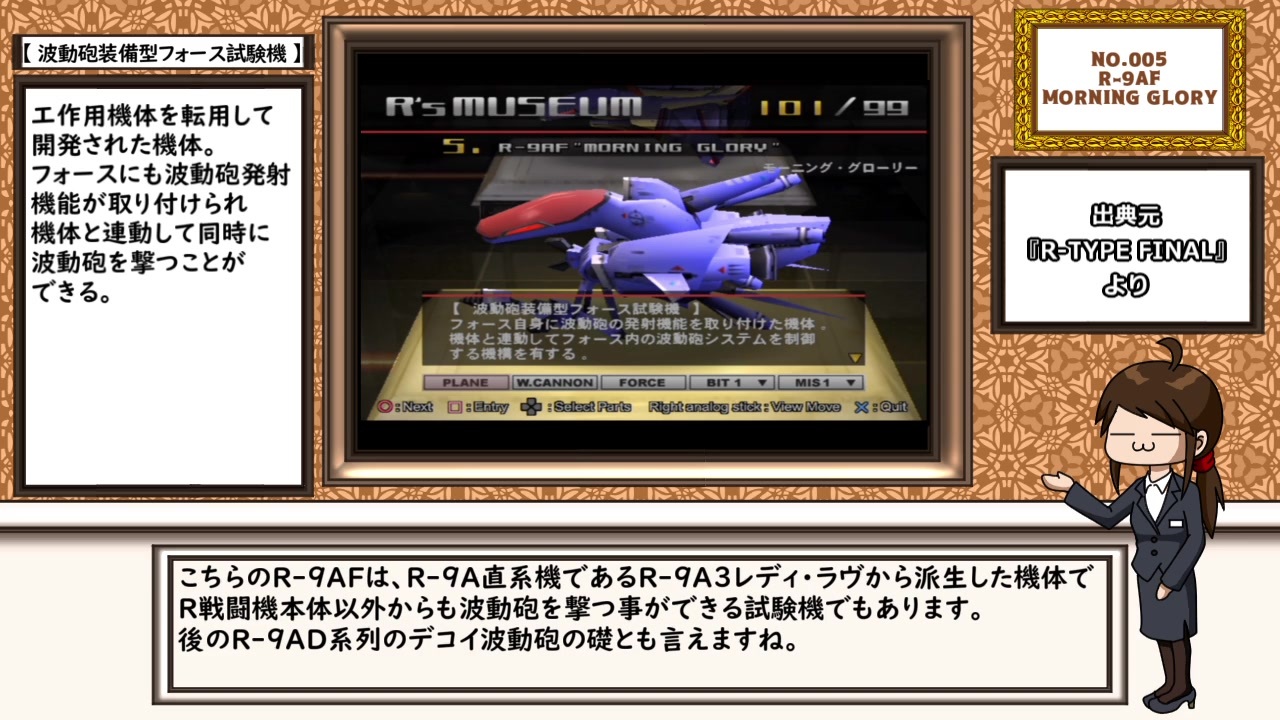 ご来館ありがとうございます。<br>こちらではR-TYPE FINALの全101機を個別に解説していきます。<br><br><span style="color: #ff0000;"><strong>※R戦闘機101機フェルト化計画とR-TYPE学会で解説した内容と重複する場合がありますが<br>予めご了承ください。</strong></span><br><br><br>No.004【<a href="https://www.nicovideo.jp/watch/sm37631140" class="watch">sm37631140</a>】 ← 【<a href="https://www.nicovideo.jp/mylist/69485195" target="_blank" rel="noopener">mylist/69485195</a>】 → No.006【<a href="https://www.nicovideo.jp/watch/sm37850055" class="watch">sm37850055</a>】<br><span style="color: #ff9900;"><strong>ぜひこちらも併せてお楽しみください</strong></span><br><strong>R戦闘機101機フェルト化計画 5機目→【</strong><a href="https://www.nicovideo.jp/watch/sm27070825" class="watch">sm27070825</a><strong>】</strong><br><br><br>R's museum年間パスポートはこちら→【<a href="https://seiga.nicovideo.jp/seiga/im10602469" target="_blank" rel="noopener">im10602469</a>】<br><br><span style="color: #9900ff;"><strong>グランゼーラMusic→<a href="https://granzellamusic.jp/" target="_blank" rel="noopener nofollow">https://granzellamusic.jp/</a></strong></span><br><br><span style="color: #ff9900;"><strong>ぐらんぜーら購買部→<a href="https://granzellastore.jp/ic/cat-004" target="_blank" rel="noopener nofollow">https://granzellastore.jp/ic/cat-004</a></strong></span><br><br><span style="color: #3c78d8;"><strong>R-TYPE FINAL2の最新トレーラー映像→<a href="https://www.youtube.com/channel/UC1q71eseep6XSYDpKueFpWA" target="_blank" rel="noopener nofollow">https://www.youtube.com/channel/UC1q71eseep6XSYDpKueFpWA</a></strong></span><br><br><br>R戦闘機101機フェルト化計画→【<a href="https://www.nicovideo.jp/mylist/50480079" target="_blank" rel="noopener">mylist/50480079</a>】<br>R-TYPE学会→【<a href="https://www.nicovideo.jp/mylist/62392399" target="_blank" rel="noopener">mylist/62392399</a>】<br>R-TYPEの二次創作手描きアニメ→【<a href="https://www.nicovideo.jp/mylist/59277561" target="_blank" rel="noopener">mylist/59277561</a>】<br>その他STG手芸作品→【<a href="https://www.nicovideo.jp/mylist/54154674" target="_blank" rel="noopener">mylist/54154674</a>】<br><br>BOOTH(STG漫画)→<a href="https://teamftype.booth.pm/" target="_blank" rel="noopener nofollow">https://teamftype.booth.pm/</a><br>twitter→<a href="https://twitter.com/handmadesiyouzu" target="_blank" rel="noopener nofollow">https://twitter.com/handmadesiyouzu</a><br>ブログ→<a href="http://blog.goo.ne.jp/suga1324" target="_blank" rel="noopener nofollow">http://blog.goo.ne.jp/suga1324</a>