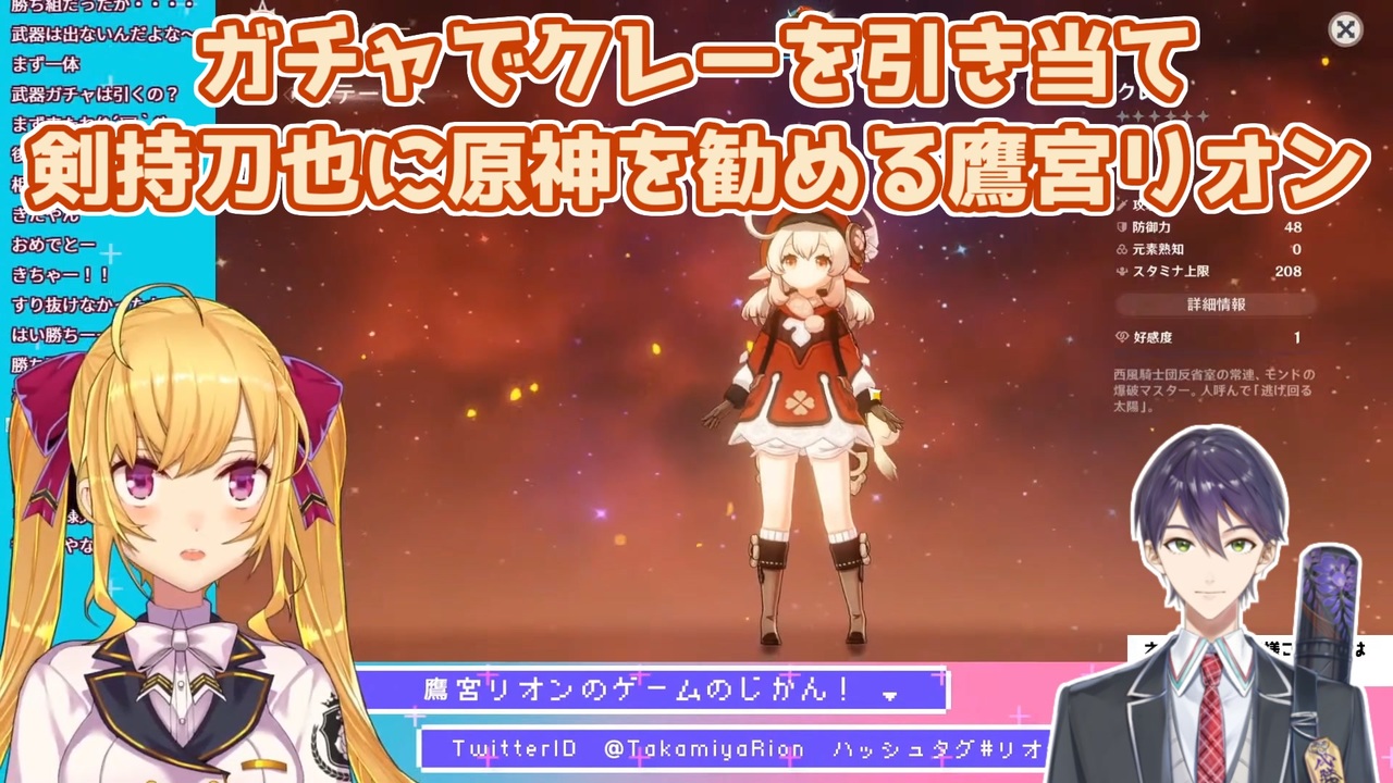 クレーちゃんかわええな~!<br>お前もそう思うだろ剣持ィ…<br><br>本家参考動画<br>・鷹宮リオン<br>【原神/Genshin】クレーガチャやるぞおお!お願い出てくれえええ【にじさんじ/鷹宮リオン】<br><a href="https://youtu.be/4RDCYzxXxZI" target="_blank" rel="noopener nofollow">https://youtu.be/4RDCYzxXxZI</a><br><br>参考元チャンネル&Twitter<br>・鷹宮リオン<br><a href="https://www.youtube.com/channel/UCV5ZZlLjk5MKGg3L0n0vbzw" target="_blank" rel="noopener nofollow">https://www.youtube.com/channel/UCV5ZZlLjk5MKGg3L0n0vbzw</a><br><a href="https://twitter.com/TakamiyaRion" target="_blank" rel="noopener nofollow">https://twitter.com/TakamiyaRion</a><br>・剣持刀也<br><a href="https://www.youtube.com/channel/UCv1fFr156jc65EMiLbaLImw" target="_blank" rel="noopener nofollow">https://www.youtube.com/channel/UCv1fFr156jc65EMiLbaLImw</a><br><a href="https://twitter.com/rei_Toya_rei" target="_blank" rel="noopener nofollow">https://twitter.com/rei_Toya_rei</a><br><br>ニコニコのダイコンマンリスト<br>「バーチャルYouTuberシリーズ」↓<br><a href="https://www.nicovideo.jp/mylist/62551838" target="_blank" rel="noopener">mylist/62551838</a><br>「バーチャルYouTuberシリーズ2」↓<br><a href="https://www.nicovideo.jp/mylist/67858437" target="_blank" rel="noopener">mylist/67858437</a><br><br>YouTubeのダイコンマンチャンネル<br><a href="https://www.youtube.com/channel/UCkpfR11cG2kk9KTJijWCJfg" target="_blank" rel="noopener nofollow">https://www.youtube.com/channel/UCkpfR11cG2kk9KTJijWCJfg</a><br><br>ダイコンマンのTwitter<br><a href="https://twitter.com/Daikon_Man_V" target="_blank" rel="noopener nofollow">https://twitter.com/Daikon_Man_V</a>