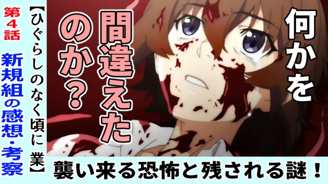 凄まじい4話でした…怖かった…<br><<<ご注意>>><br>毎週のアニメのみを辿って感想・考察を出していきたいと思います。<br>新規視聴者さんのためにもネタバレコメントはご遠慮ください。<br>旧作を用いた描写比較、設定解説、出ていない用語の使用、注目点の示唆なども同様です。<br><br><<コンセプト>><br>ネタバレが苦手な人でも楽しめる動画を目指しています!<br>皆さんの感想などもお聞かせいただけると嬉しいです!<br>新アニメとしての新規視点での考察なども歓迎です!<br><br>一緒に追いかけながらアニメを楽しみましょう!<br>↓【Youtubeでチャンネル登録】<br><a href="https://www.youtube.com/channel/UC3i6fY7gwjIo8HJo7G_N4mA?sub_confirmation=1" target="_blank" rel="noopener nofollow">https://www.youtube.com/channel/UC3i6fY7gwjIo8HJo7G_N4mA?sub_confirmation=1</a><br><br>【ツイッター】告知や面白いものの共有用<br><a href="https://twitter.com/toori0303" target="_blank" rel="noopener nofollow">https://twitter.com/toori0303</a><br>【pixiv】動画用に描いた絵や漫画のまとめ等<br><a href="https://www.pixiv.net/users/9142671" target="_blank" rel="noopener nofollow">https://www.pixiv.net/users/9142671</a><br>【欲しい物リスト】送って頂いた原作書籍はアニメに絡めて動画を出せたらと思っています。<br><a href="https://www.amazon.jp/hz/wishlist/ls/2KZ6H6K2WSG4Z?ref_=wl_share" target="_blank" rel="noopener nofollow">https://www.amazon.jp/hz/wishlist/ls/2KZ6H6K2WSG4Z?ref_=wl_share</a><br>【質問箱】匿名で質問したいという方へ<br><a href="https://marshmallow-qa.com/toori0303" target="_blank" rel="noopener nofollow">https://marshmallow-qa.com/toori0303</a><br>【ブログ】アニメを見て動画作成用に使った情報をまとめています<br><a href="http://tooltoyama.livedoor.blog/" target="_blank" rel="noopener nofollow">http://tooltoyama.livedoor.blog/</a><br><br>【関連リンク】<br>公式HP<br><a href="https://higurashianime.com/" target="_blank" rel="noopener nofollow">https://higurashianime.com/</a><br>