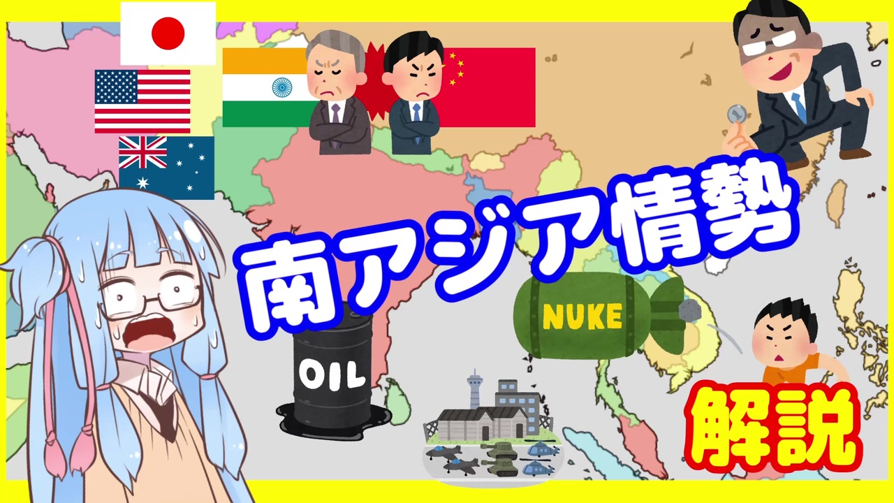 南アジア情勢とか言いながら、ほぼインドと中国の解説動画。<br>中東~インド洋~太平洋地域のシーレーンの事情のみをまとめた動画とか、需要ありますかね?<br><br>ここまで投稿した動画の総再生数が5万回を超えました。<br>みなさん、ご視聴ありがとうございます。引き続きよろしくお願いします。<br><br />※この動画ではA.I.VOICEを使っていますが、普及具合を鑑みてタグにはVOICEROID解説を併記させていただいております。<br><br>世界情勢検索ボット作成中(note):<a href="https://note.com/todo_1582/n/n3b76a6aafd0d" target="_blank" rel="noopener nofollow">https://note.com/todo_1582/n/n3b76a6aafd0d</a><br>ニコニコチャンネル:<a href="https://ch.nicovideo.jp/to-do" target="_blank" rel="noopener nofollow">https://ch.nicovideo.jp/to-do</a><br>現代史解説 <a href="https://www.nicovideo.jp/series/166058" target="_blank" rel="noopener">series/166058</a><br>世界情勢振り返り <a href="https://www.nicovideo.jp/series/352199" target="_blank" rel="noopener">series/352199</a><br>ムスリみの違い解説 <a href="https://www.nicovideo.jp/series/352200" target="_blank" rel="noopener">series/352200</a><br>マイリスト <a href="https://www.nicovideo.jp/mylist/69599837" target="_blank" rel="noopener">mylist/69599837</a><br>Youtube:<a href="https://youtube.com/playlist?list=PL6pjlejdhtK6JxdZZp_3ZqAGmDghvdfu0" target="_blank" rel="noopener nofollow">https://youtube.com/playlist?list=PL6pjlejdhtK6JxdZZp_3ZqAGmDghvdfu0</a>