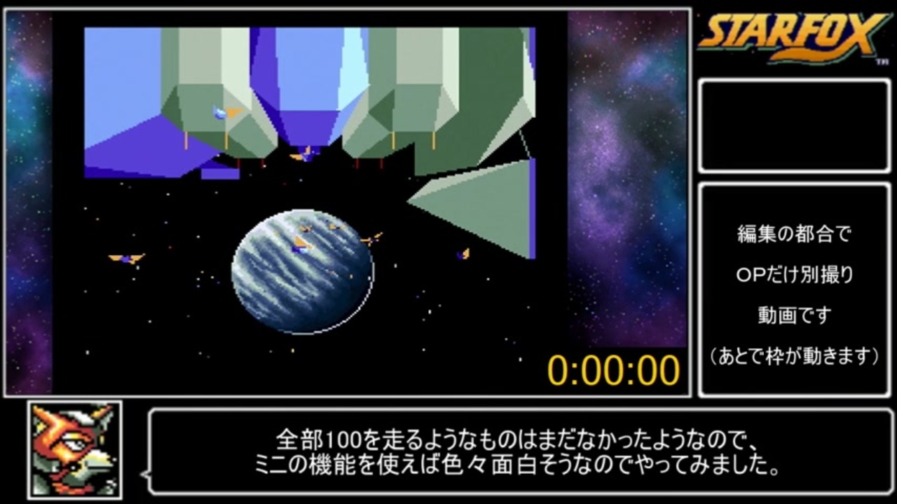 長く険しい戦いを走り終えたので初投稿です。<br><br><br>・レギュレーション・<br> <br> ミニスーファミ版orニンテンドースイッチ版 『スターフォックス』で「全メインステージアベレージ100%でクリア」するまでのタイムアタック。<br><br><br> タイマースタート:コントロール選択画面での「ゲーム」を押した瞬間。<br> <br> ストップ:3回目のベノムのアベレージが100%と表示された瞬間。<br><br><br>・細かなルールについて・<br><br>①「中断セーブ・ロード」は利用は可能。<br><br>②「巻き戻し等、中断セーブ・ロード以外の機能」は利用不可。<br><br>③タイム測開始時には、4つの中断データは何もない状態とする。<br><br><br>以上のルールを守り、タイムアタックをします。<br><br><br>次⇒<a href="https://www.nicovideo.jp/watch/sm37791615" class="watch">sm37791615</a><br><br><a href="https://www.nicovideo.jp/mylist/60706985" target="_blank" rel="noopener">mylist/60706985</a><br><br>10/30追記: 春巻さん・棚町薫さん・;(∩´ω`∩);:さん・waraさん・gigiさん・白雪 楓さん・7SEさん・くはれさん・たけのこさん・むー太さん・アンドルフおじさーんさん・突起玉さん広告ありがとナス!<br><br>10/31追記:シュッツェさん・白刹(ハク)さん広告ありがとナス!<br><br>11/1追記:Ktrgさん広告ありがとナス!<br><br>11/2追記:きまぐれさん広告ありがとナス!<br><br>11/9追記:コメ返信 <br><br>Q.これアベレージスコアの条件って何?<br> <br>A.このスコアはステージ内の敵をどれぐらい倒したかの割合です。だいたい仲間一人で、+2%補正してくれるので、仲間が死ぬと敵を逃がすと100%になりにくくなります。<br><br>11/18追記:月刊RTAランキング10月号(<a href="https://www.nicovideo.jp/watch/sm37836095" class="watch">sm37836095</a>)で99位に入りました!やったー<br><br>11/23追記:ペパーの犬さん広告ありがとナス!<br><br>11/29追記: アー・ダンさん広告ありがとナス!<br><br>21.2/12追記: @猫の亜奈座さんともしかしたらそれまでにしてくれた方で広告ありがとナス!