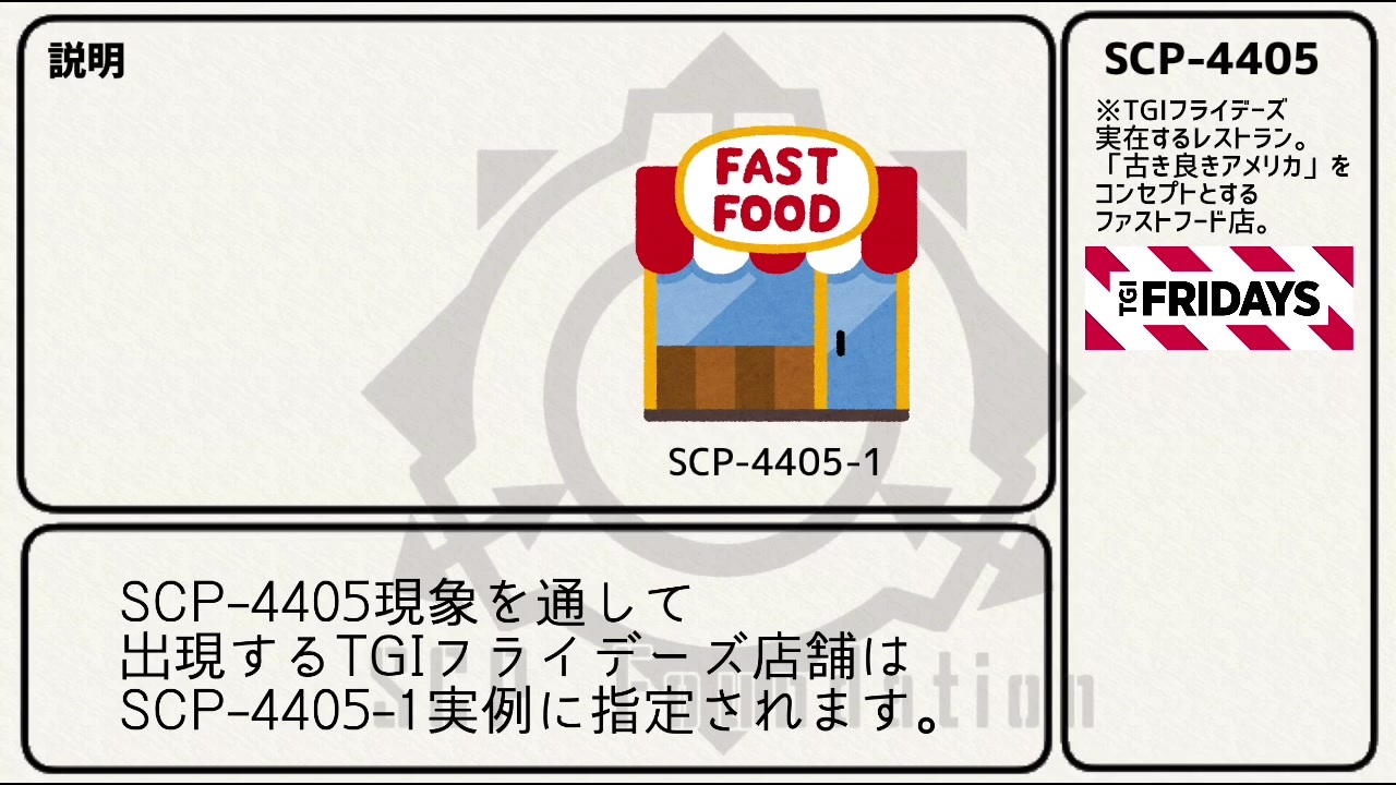 <span style="color: #262626;">累計37作目。</span><br><br><strong>「本当にこれで… 終わりなんですね。」</strong><br><br>ただいま。<br>あと一作です。<br><br>Author: OthellotheCat、DolphinSlugchugger<br>※共同制作<br>Title: SCP-4405 - 時の終わりのフライデーズ <br>Source: <a href="http://www.scp-wiki.net/scp-4405" target="_blank" rel="noopener nofollow">http://www.scp-wiki.net/scp-4405</a><br>CC BY-SA 3.0<br />—————————————————————————————————————————<br><span style="color: #ff0000; font-size: 18px;"><strong><<イセエビのSCP解説動画シリーズ>></strong></span><br><span style="font-size: 18px;"><strong><a href="https://www.nicovideo.jp/series/68234" target="_blank" rel="noopener nofollow">https://www.nicovideo.jp/series/68234</a></strong></span><br><span style="color: #ff0000; font-size: 18px;"><strong><<イセエビの最新作>></strong></span><br><span style="font-size: 16px;"><strong>SCP-1375-JP『漢の荒波 - 頑固一徹反ミーム一本釣り』【ゆっくり解説】</strong></span><span style="font-size: 18px;"><strong><a href="https://www.nicovideo.jp/watch/sm38425129" class="watch">sm38425129</a></strong></span><br>—————————————————————————————————————————<br>Twitter→<a href="https://mobile.twitter.com/Be_to_be_eaten" target="_blank" rel="noopener nofollow">https://mobile.twitter.com/Be_to_be_eaten</a><br>Youtube→<a href="https://m.youtube.com/channel/UCvbb-AW7AyvjCDtSNDTF8lw" target="_blank" rel="noopener nofollow">https://m.youtube.com/channel/UCvbb-AW7AyvjCDtSNDTF8lw</a>